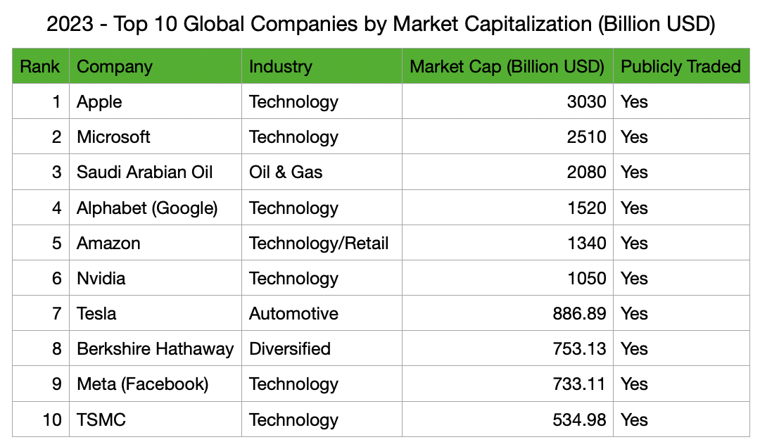 根据City Index的数据,2023年全球市值前十的企业依次为:苹果(Apple)以3.03万亿美元领先,其后是微软(Microsoft)的2.51万亿美元,以及沙特阿美(Saudi Aramco)的2.08万亿美元。