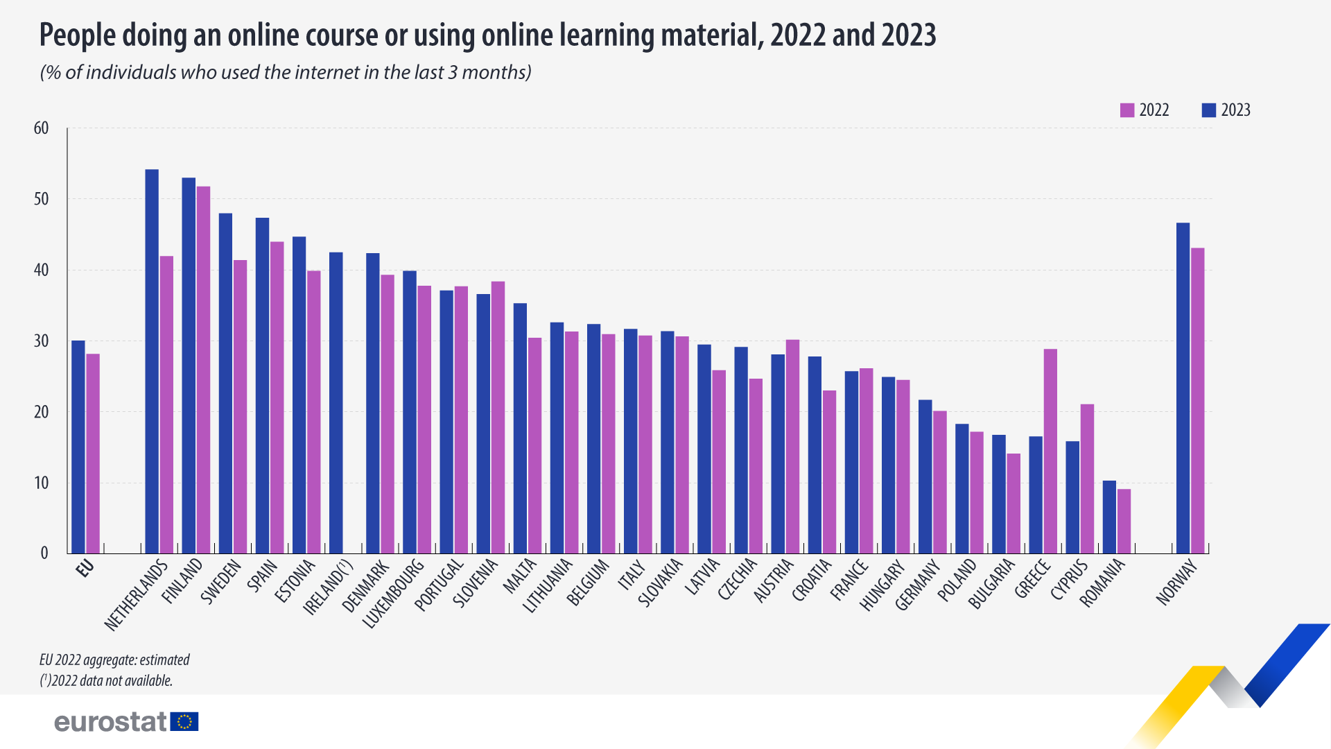 2023年,欧盟16岁至74岁的网民中有30%报告称,调查前的三个月里上过在线课程或使用过在线学习材料。这比2022年(28%)增长了2个百分点。