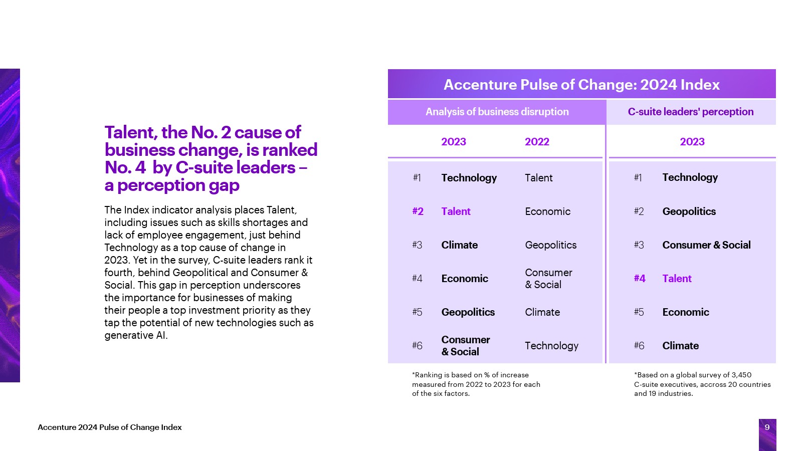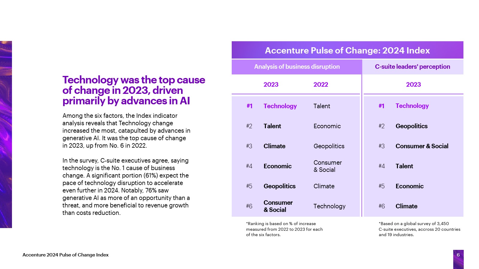 指标分析显示,由于生成式人工智能的进步,技术颠覆性在2023年增长最快,从2022年的第六位上升到第一位。高管们还将技术列为变革的首要原因。