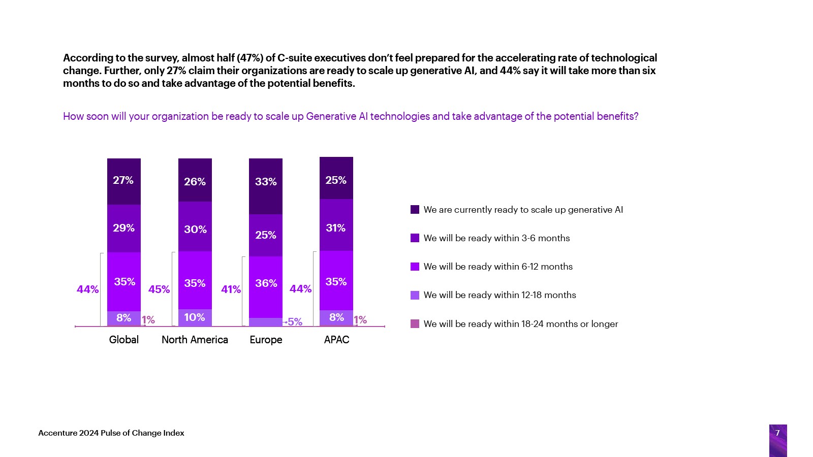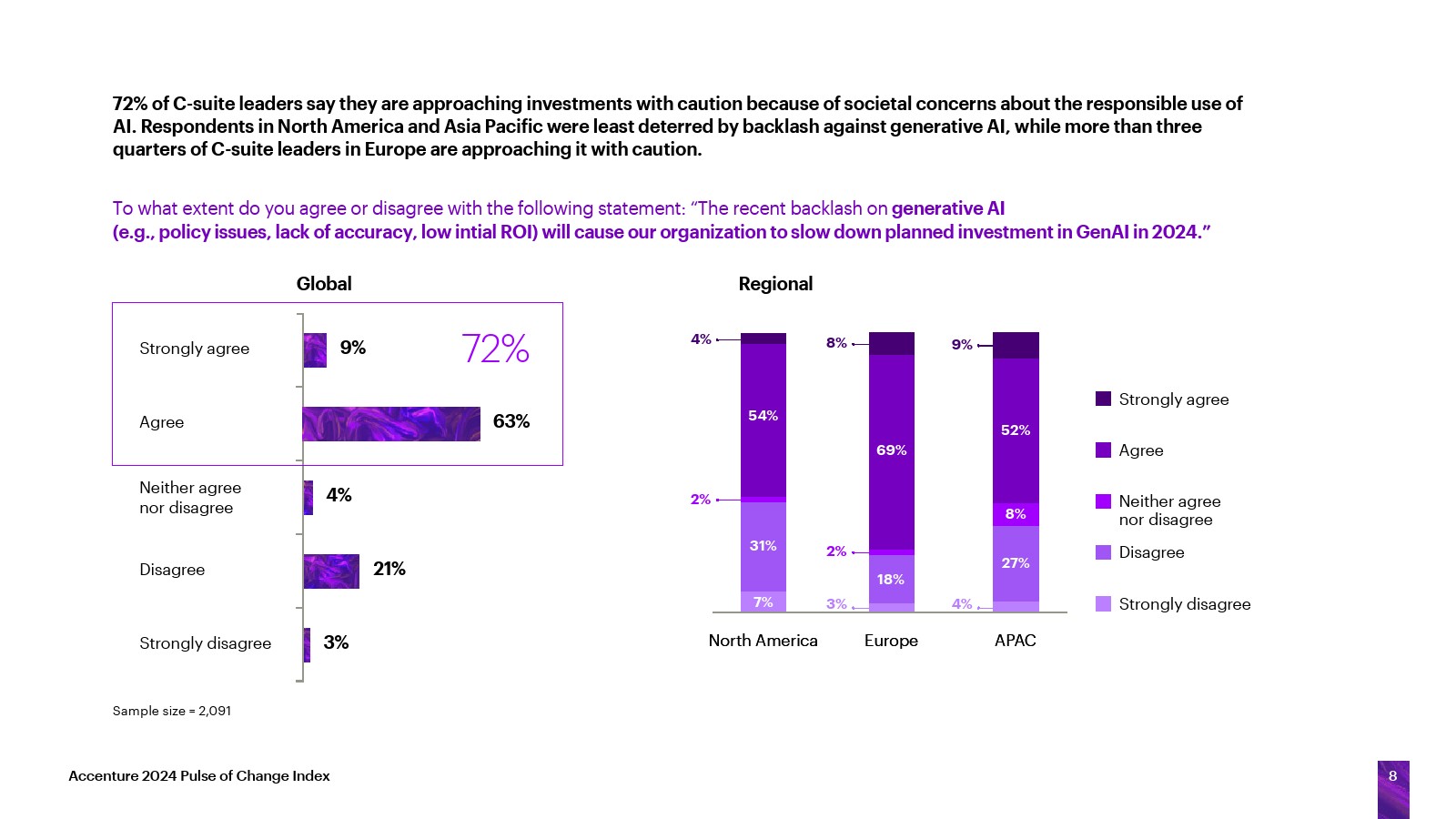 近一半的受访者(47%)表示,他们没有为技术变革的加速做好充分准备;72%的受访者表示,由于社会对负责任地使用人工智能的担忧,他们现在更加谨慎地对待投资。