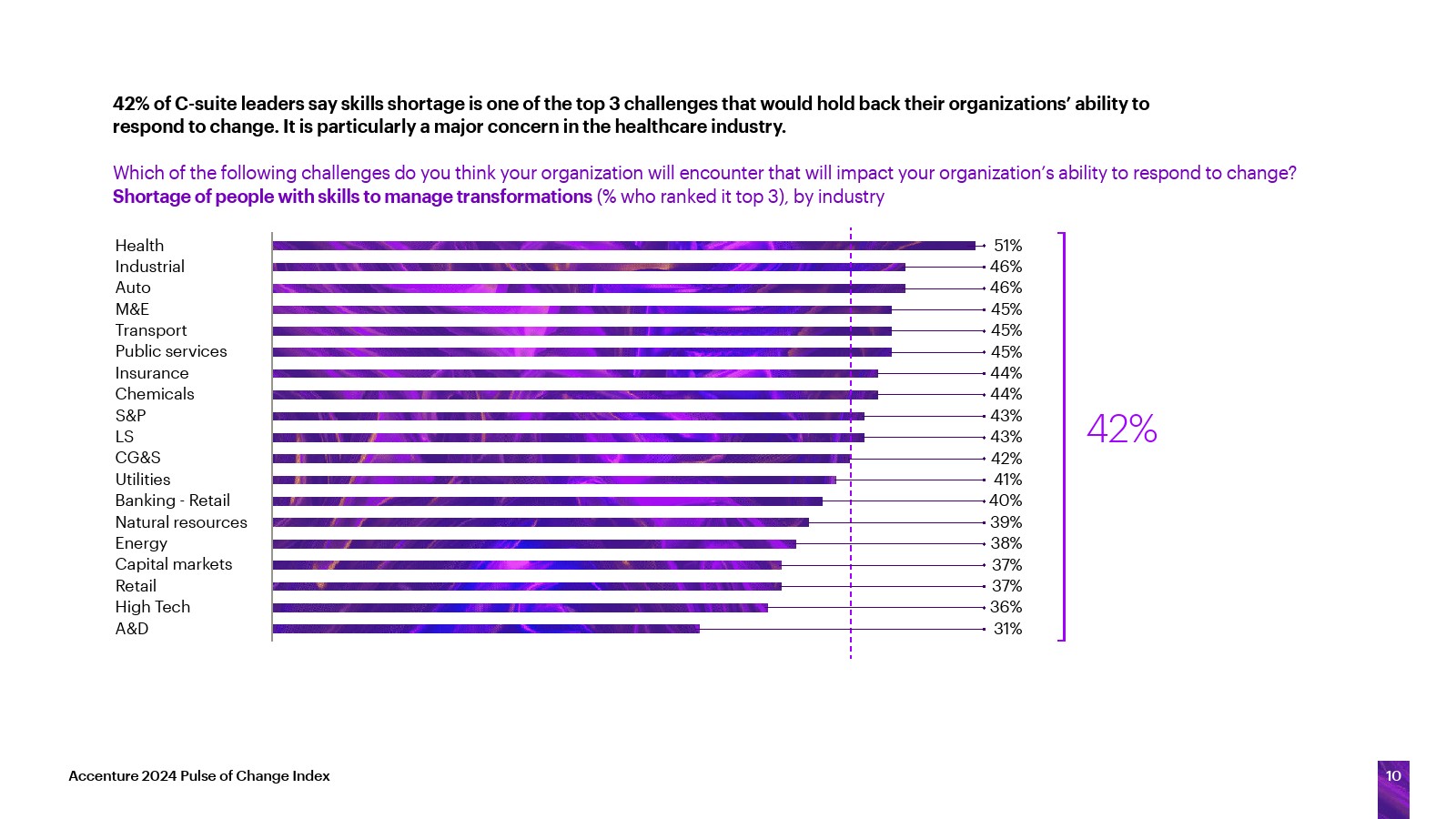 人才是业务变革的第二大原因,高管将人才排在第四位。42%的高管表示,技能短缺是阻碍其组织应对变革的三大挑战之一,这凸显了企业将人才战略放在首位的重要性,尤其是在企业努力挖掘新技术潜力的时候。