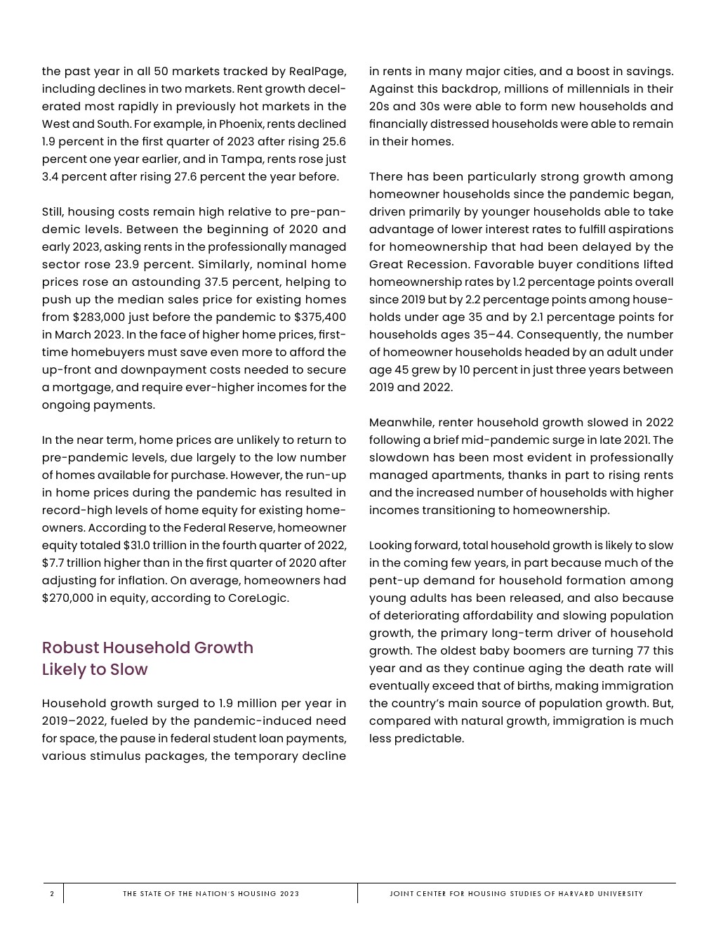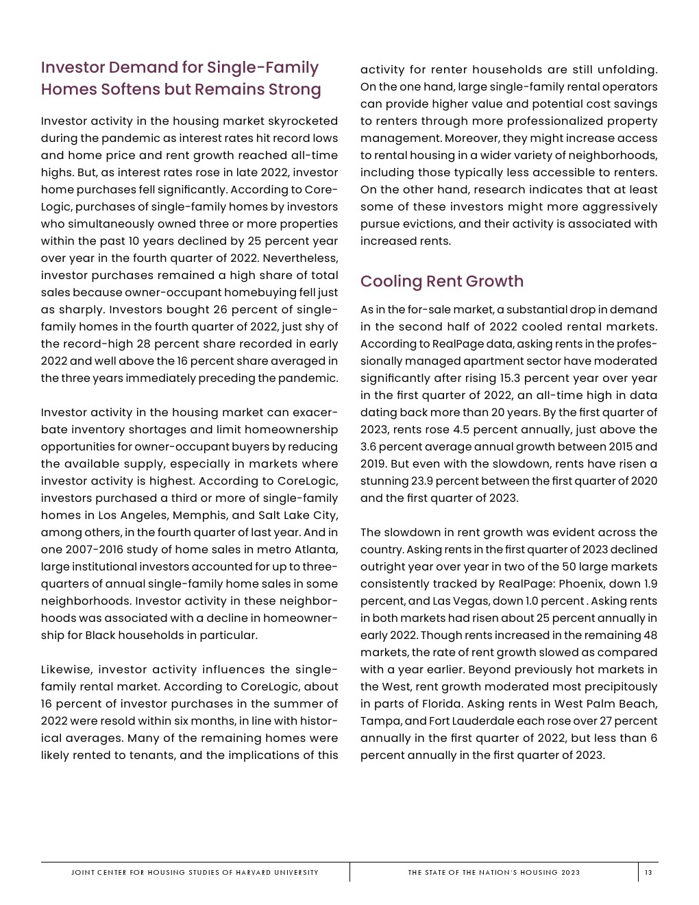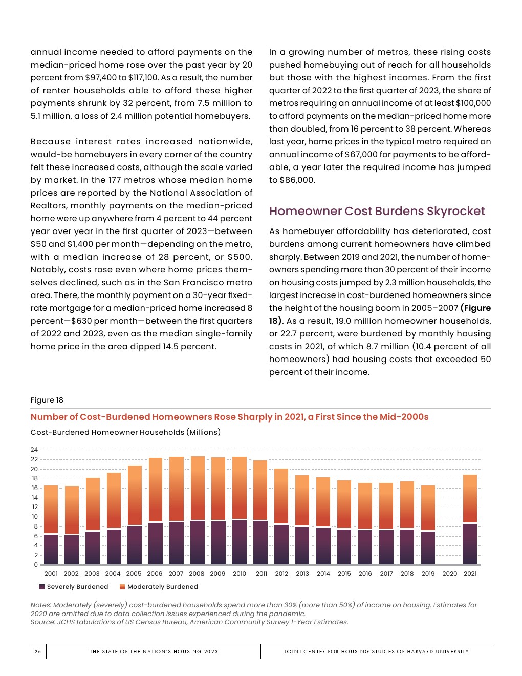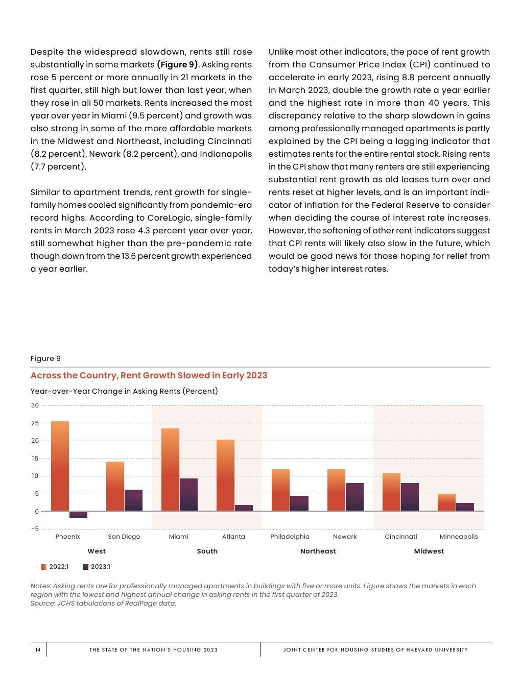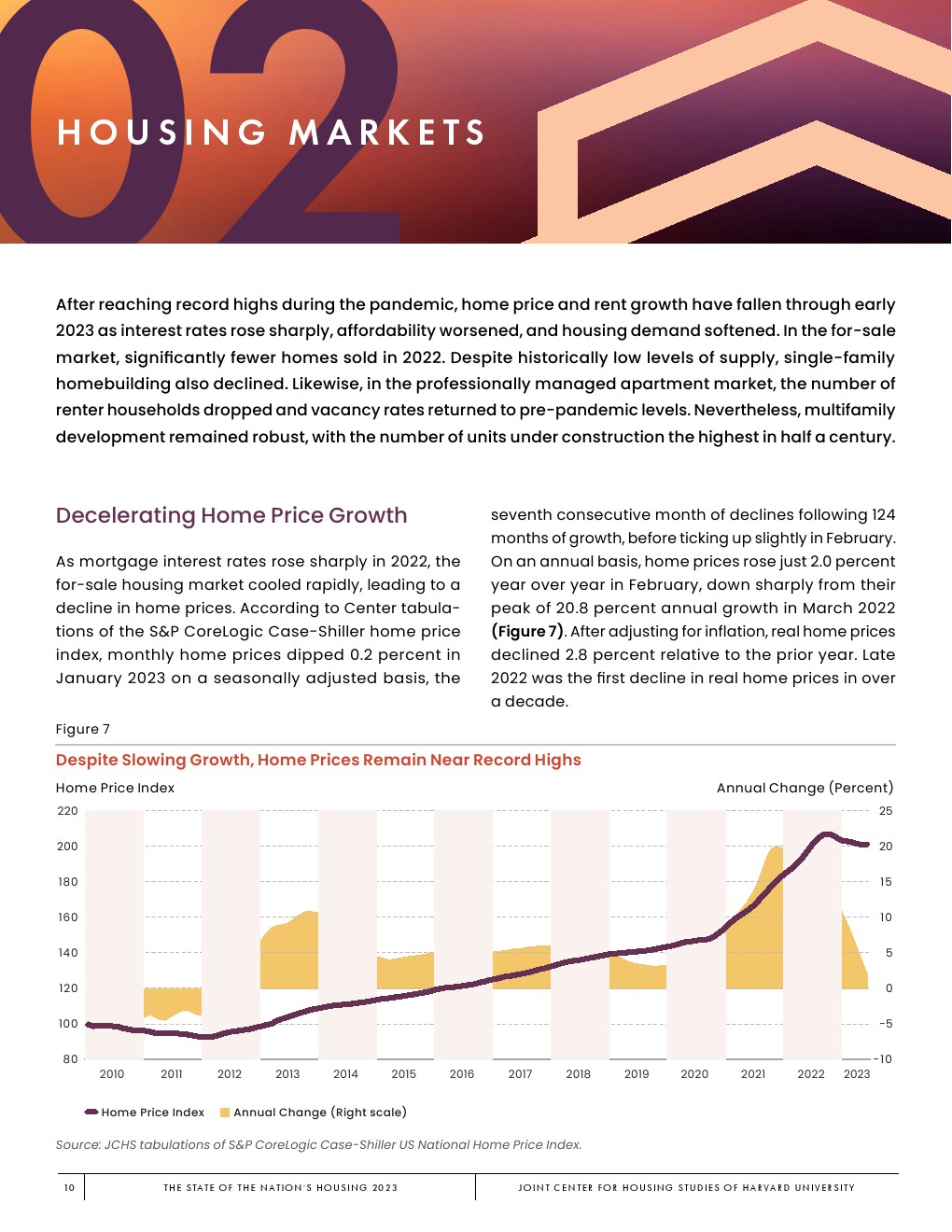 哈佛大学住房研究联合中心发布了“2023年美国住房报告”。尽管房主和租房者面临更高的成本,但房地产市场仍在继续降温。在待售方面,房屋销售和建设水平正在下降,房价上涨的速度也在下降。美国市场正在经历租金增长急剧放缓和空置率上升。尽管如此,房价和租金仍高于大流行前的水平。数以百万计的家庭现在因房价过高而失去了住房所有权,或与住房成本负担作斗争,或完全没有住房,其中包括不成比例的有色人种,这增加了解决国家住房短缺的政策需求,这是负担能力危机的根源。