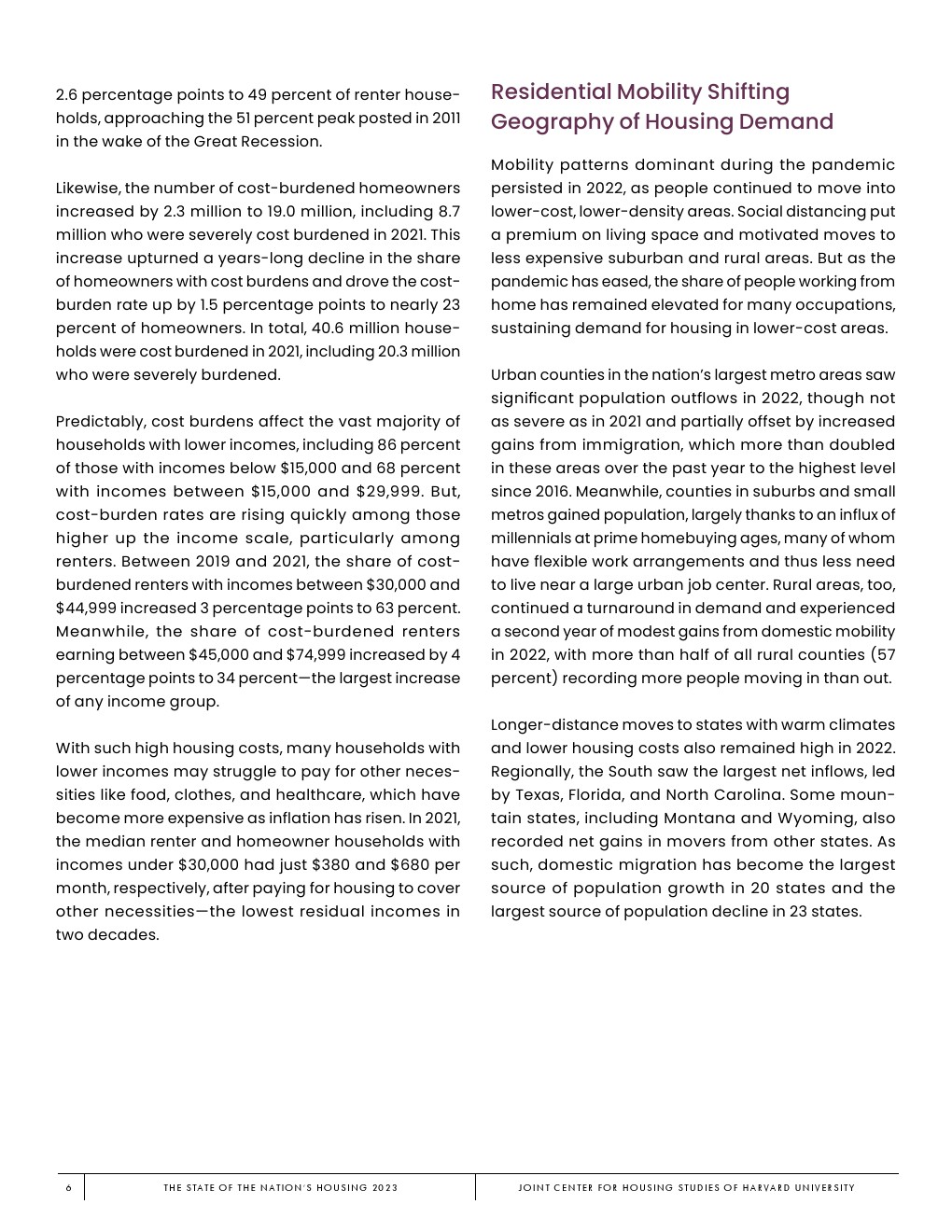 大流行期间占主导地位的流动模式在2022年持续存在,人们继续向成本更低、密度更低的地区迁移。社交距离增加了居住空间的溢价,并促使人们搬到价格较低的郊区和农村地区。但随着疫情的缓解,在家工作的人所占比例仍然很高,从而维持了对低成本地区住房的需求。