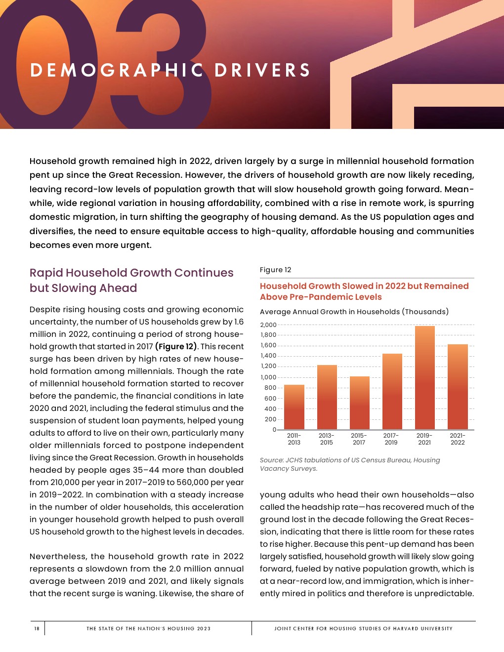 2019 – 2022年,受疫情引发的空间需求、联邦学生贷款暂停支付、各种刺激计划、许多大城市租金暂时下降以及储蓄增加的推动,家庭增长飙升至每年190万户。