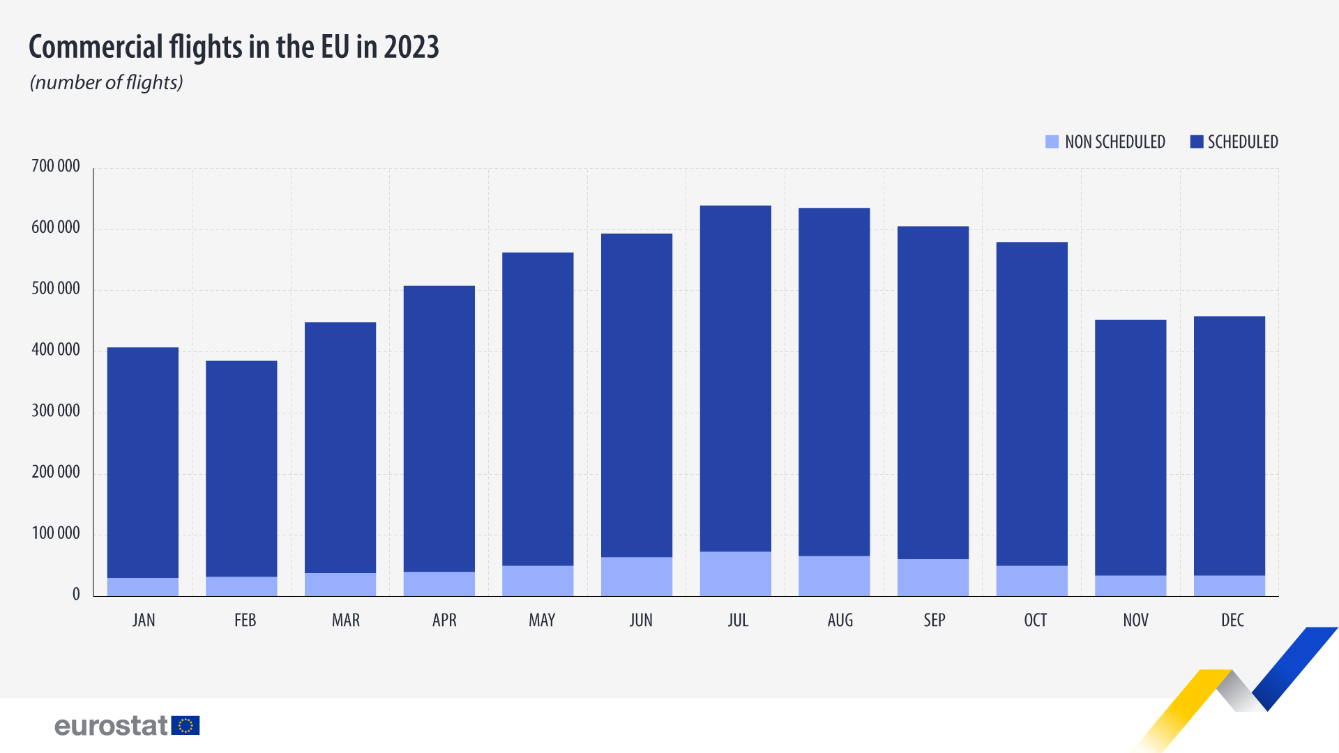 2023年,非定期航班(包机和其他特殊航班)占所有航班的9.2%。夏季——6月、7月和8月的比例最高,分别为10.9%、11.4%和10.4%。