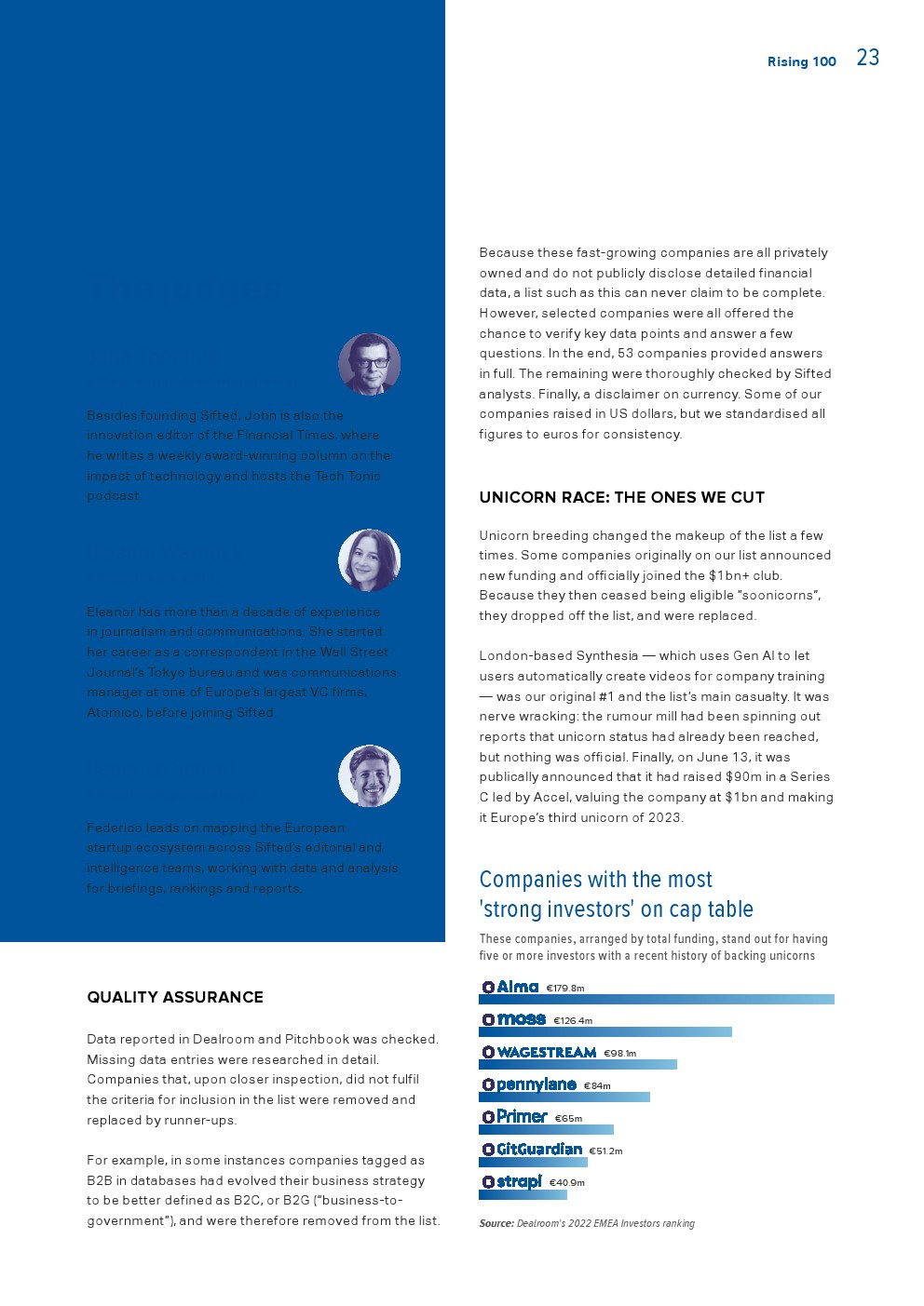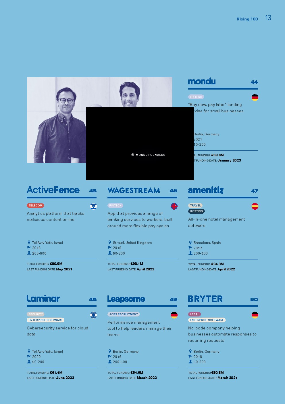 支付公司Alma(排名第41位)和员工银行应用wageststream(排名第46位)拥有最多的“强势投资者”,分别有6家,包括Bpifrance、Northzone和Balderton Capital。