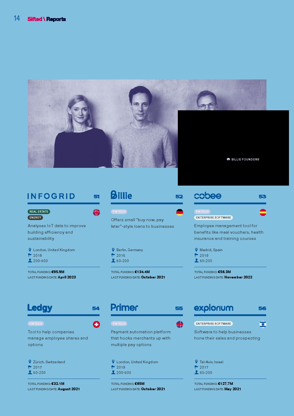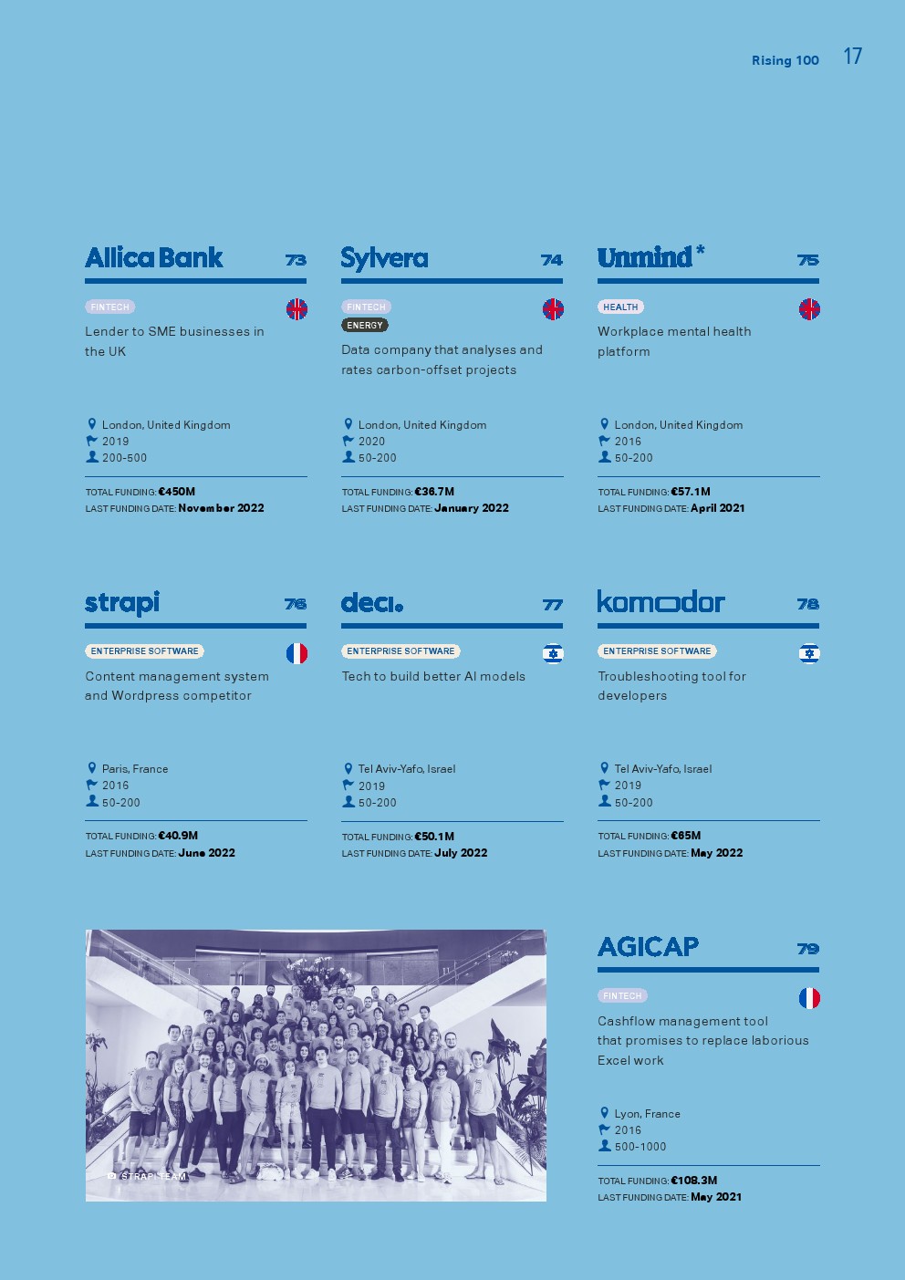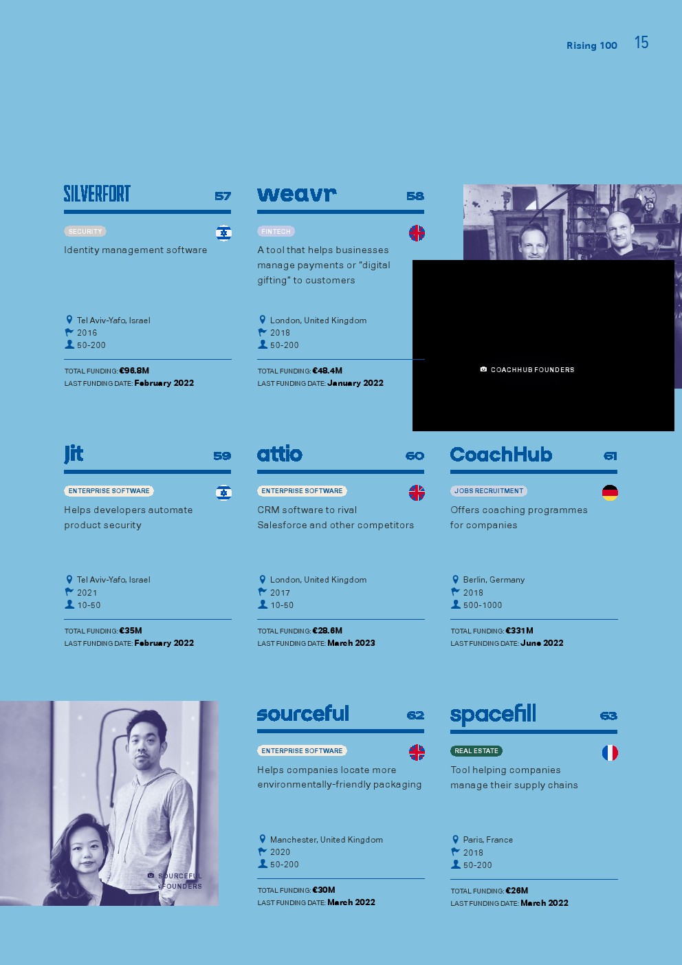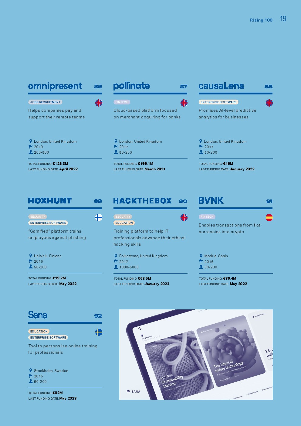 英国中小企业贷款机构ALLICA BANK(排名第73)是100家公司中资金最充足的,获得了4.5亿欧元投资。COACHHUB(排名第61)是一家为企业提供培训工具的企业,获得了3.31亿欧元的投资。然后是POLLINATE(第87名),这是一个专注于为银行获取商家的平台,市值为1.99亿欧元。