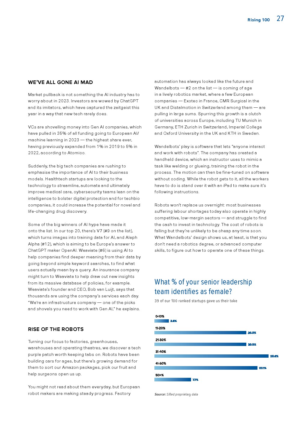在100家公司中只有17家是由女性创立或共同创立的,这反映出女性在欧洲和以色列科技创业行业的代表性明显不足。