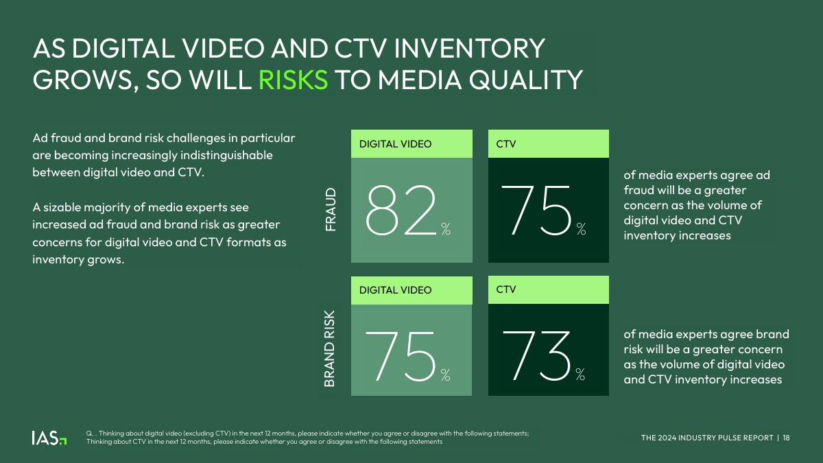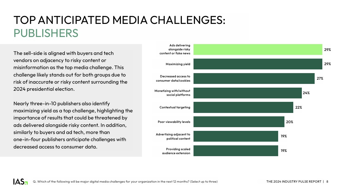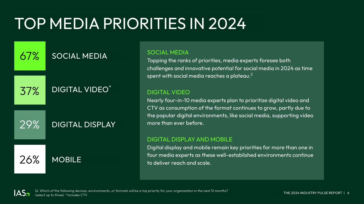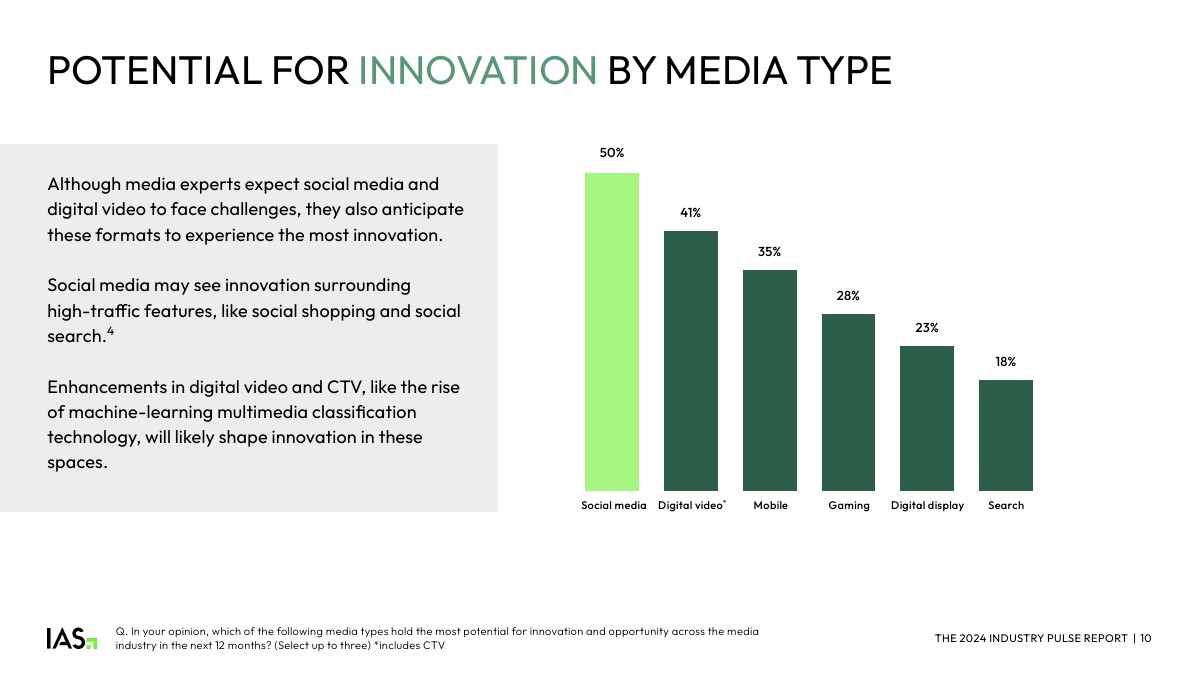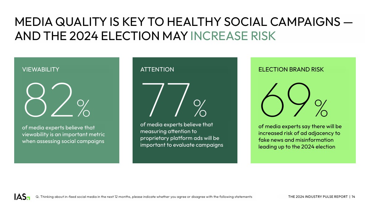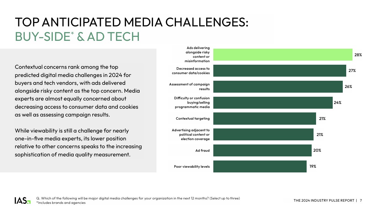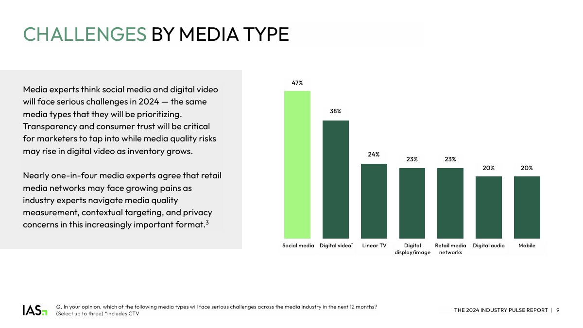 IAS发布了“2024年行业脉搏报告之美国版”。社交媒体是今年最可能面临严峻挑战的媒体类型。这可能与这些平台固有的风险有关,特别是在选举年,因为社交媒体被认为是最容易受到品牌风险和广告欺诈影响的环境。