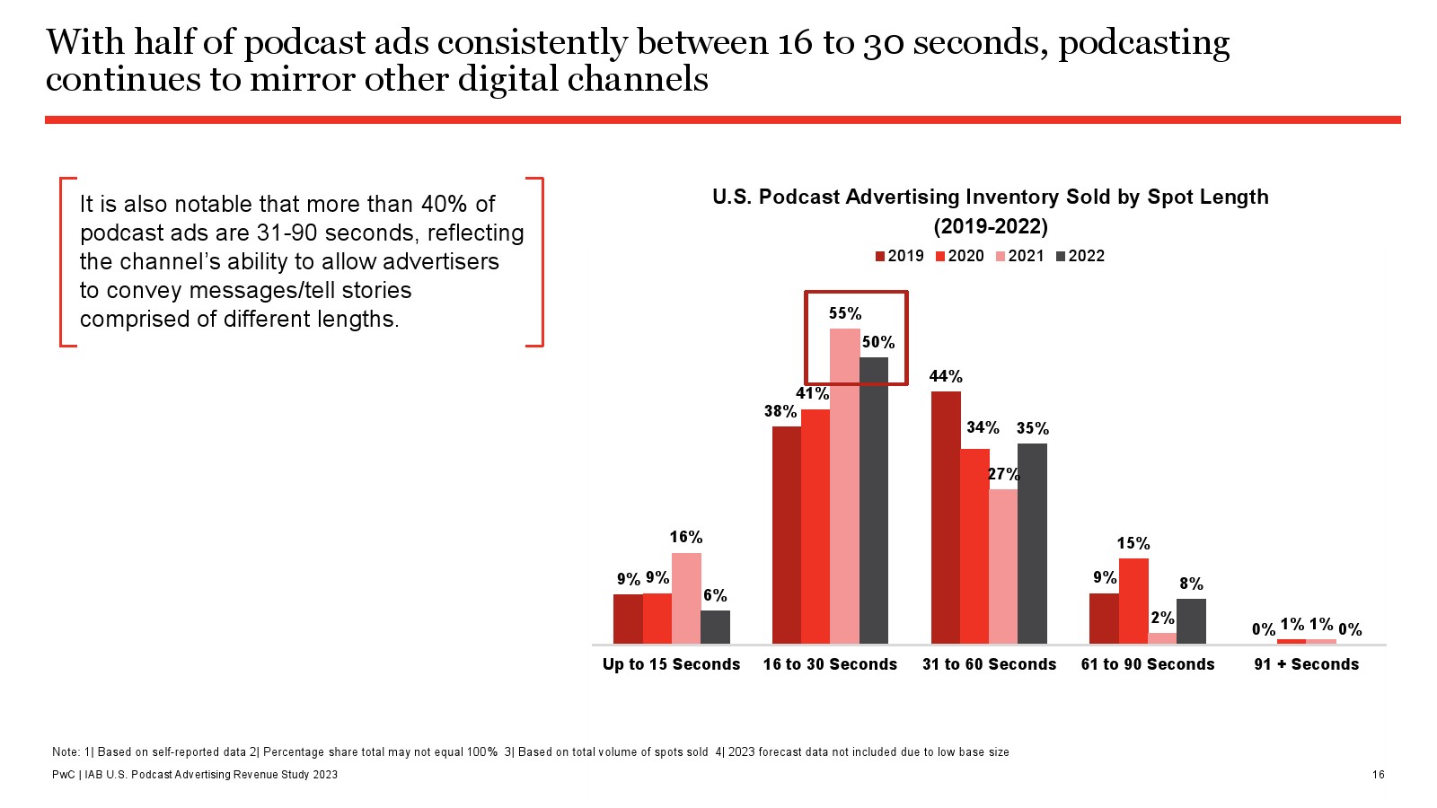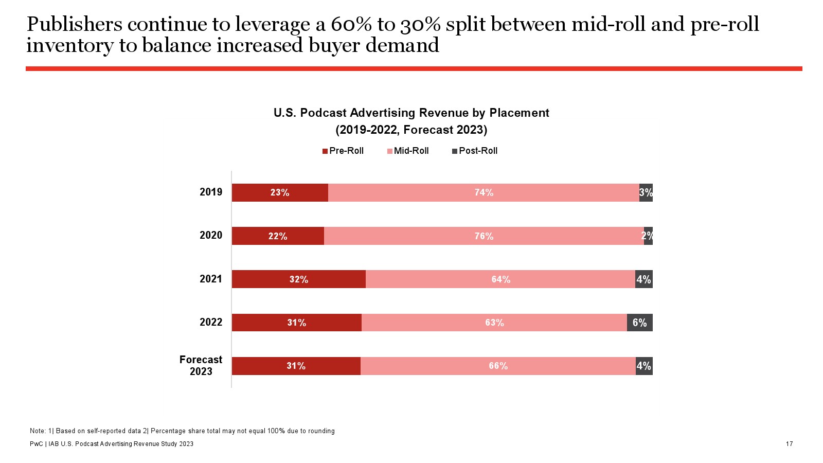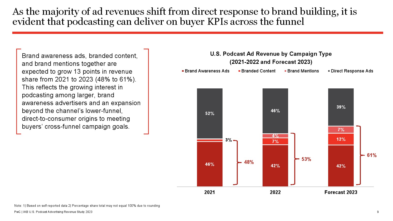 大部分播客广告收入从直接响应转向品牌建设(收入份额:2021年为48%,2023年为61%),很明显,该渠道可以在整个渠道中实现买家KPI。