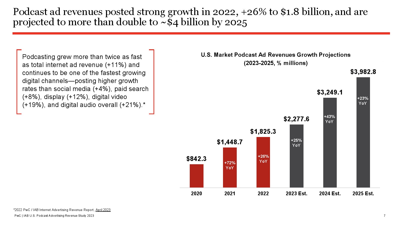 播客广告收入在2022年强劲增长,增长26%,达到18亿美元,预计到2025年将增长一倍以上,达到40亿美元