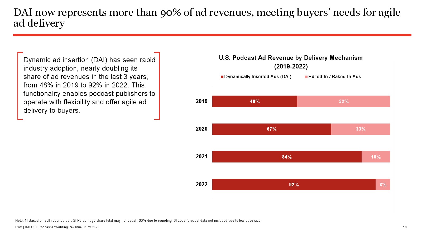 DAI现在代表了90%以上的广告收入,满足了买家对敏捷交付的需求。有一半的播客广告持续在16到30秒之间,播客继续效仿其他数字去打奥。发布商继续利用60%至30%的中期库存和前期库存来平衡不断增长的买家需求。