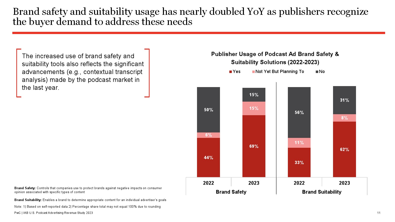 发布商认识到买家对品牌安全和适用性解决方案的需求,其使用率同比几乎翻了一番,品牌安全需求从44%增长至69%;品牌适合度从33%增长至62%。