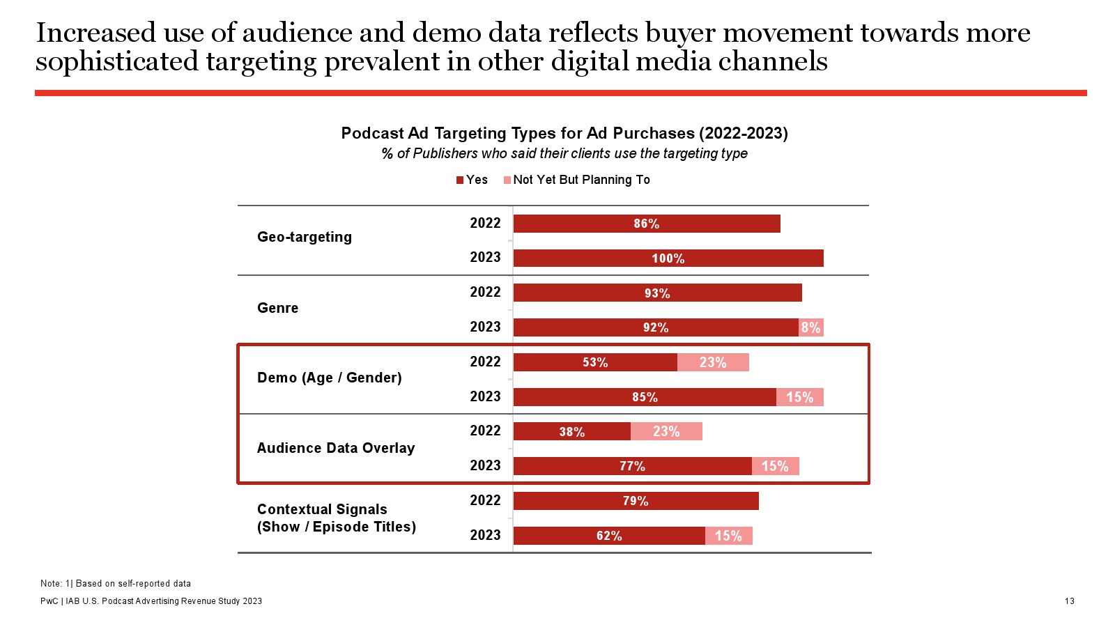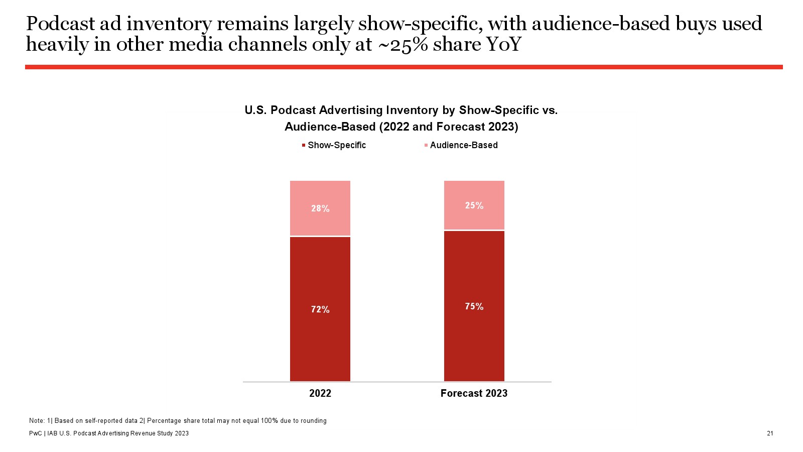 播客广告库存仍然主要是针对特定节目的,而在其他媒体渠道中大量使用的基于受众的购买仅占25%左右的份额。