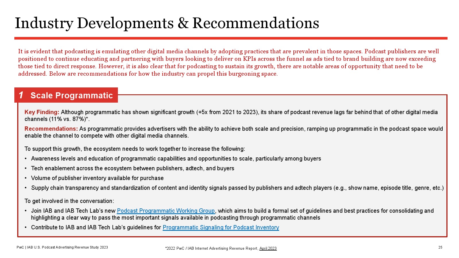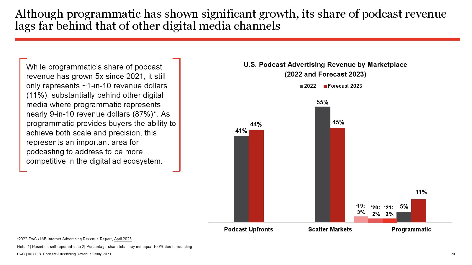尽管广告程序化购买已经显示出显著的增长,从2021年到2023年增长5倍,但其在播客收入中的份额远远落后于其他数字媒体渠道(11% vs. 87%)。