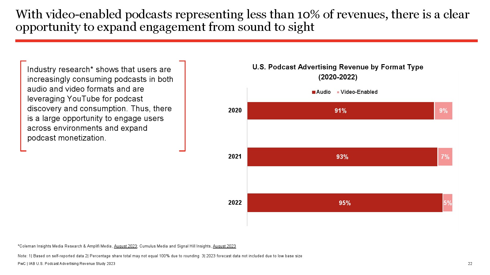 视频播客在收入中所占的比例不到10%,因此很明显有机会将用户粘性从声音扩展到视觉。