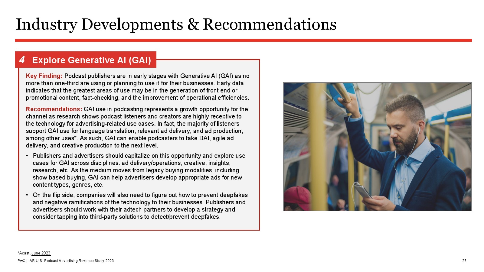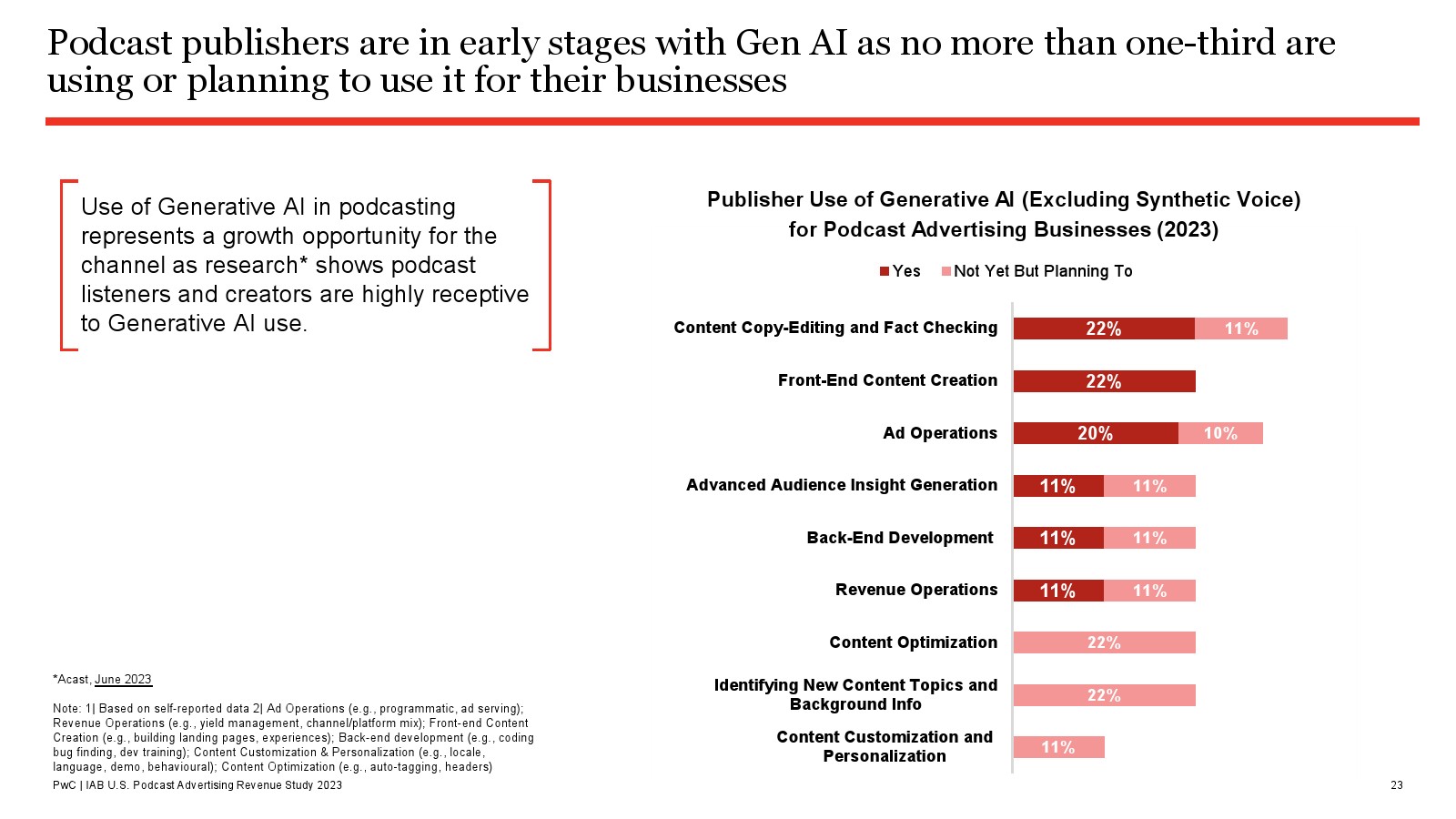 由于视频播客只占总收入的不到10%,因此很明显有机会将用户粘性从声音扩展到视觉。播客发布商还处于人工智能的早期阶段,只有不到1/3的人正在使用或计划将其用于他们的业务。