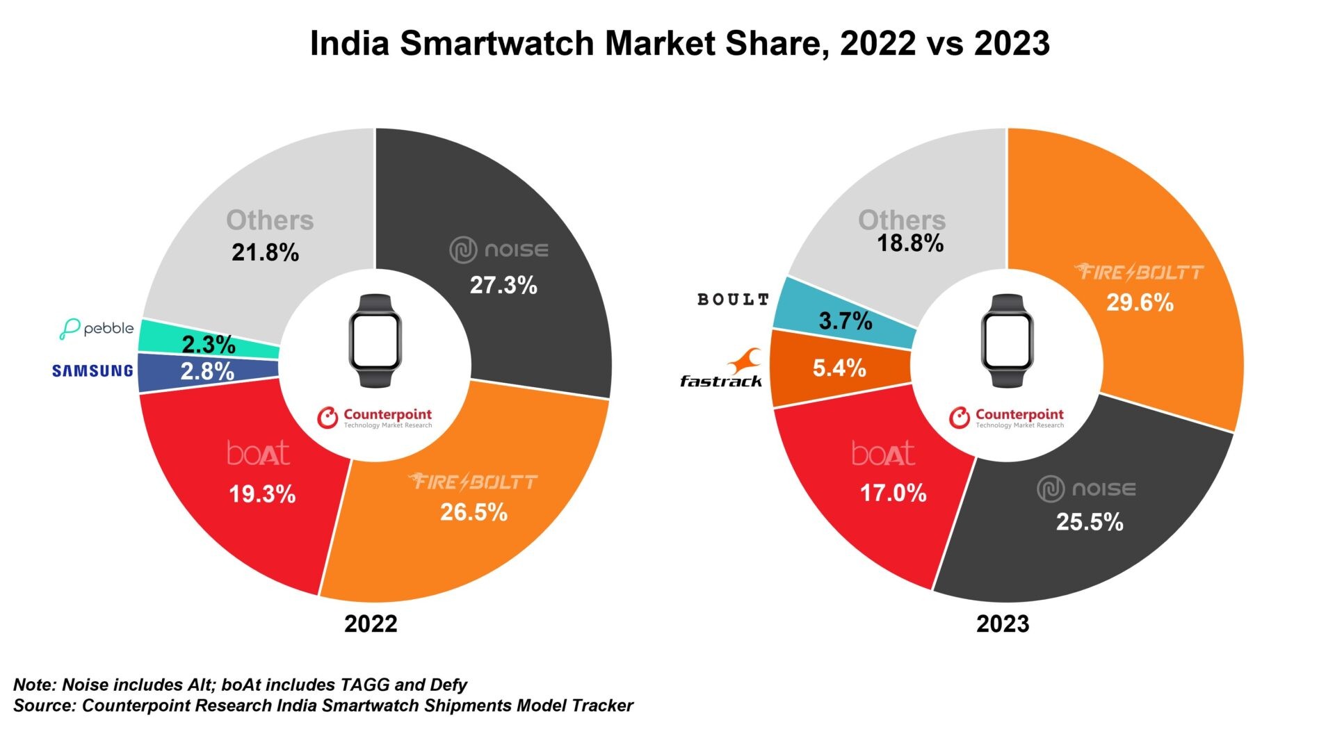 - Noise以26%的市场份额位居第二。Noise Colorfit Icon 2和Colorfit Icon Buzz是2023年最畅销的智能手表。该品牌在2023年扩大了零售业务,并扩大了儿童智能手表类别的投资组合。