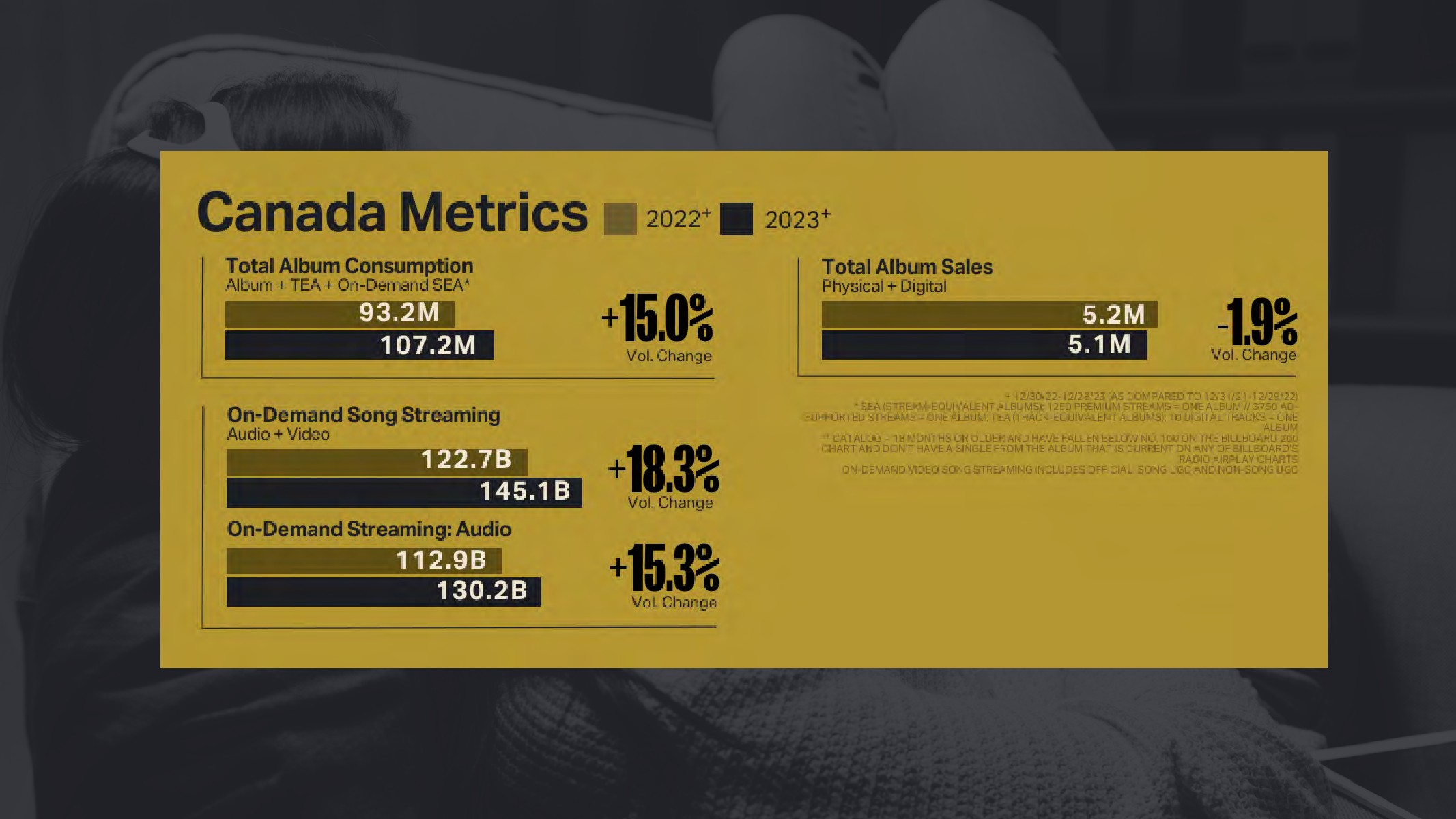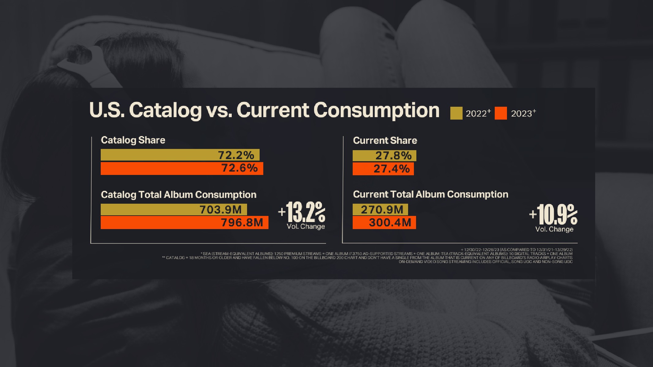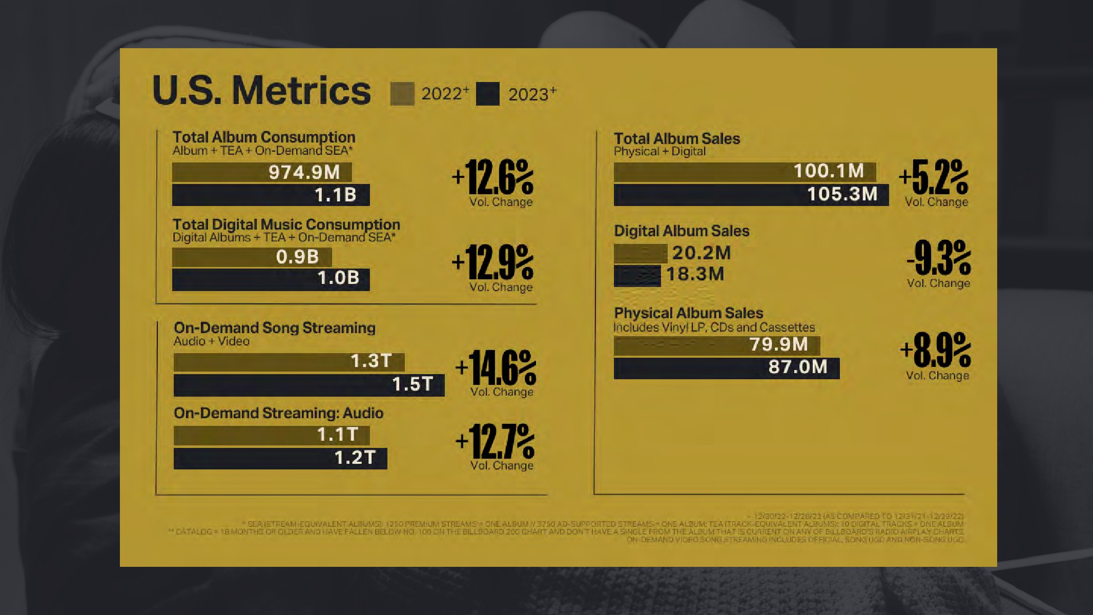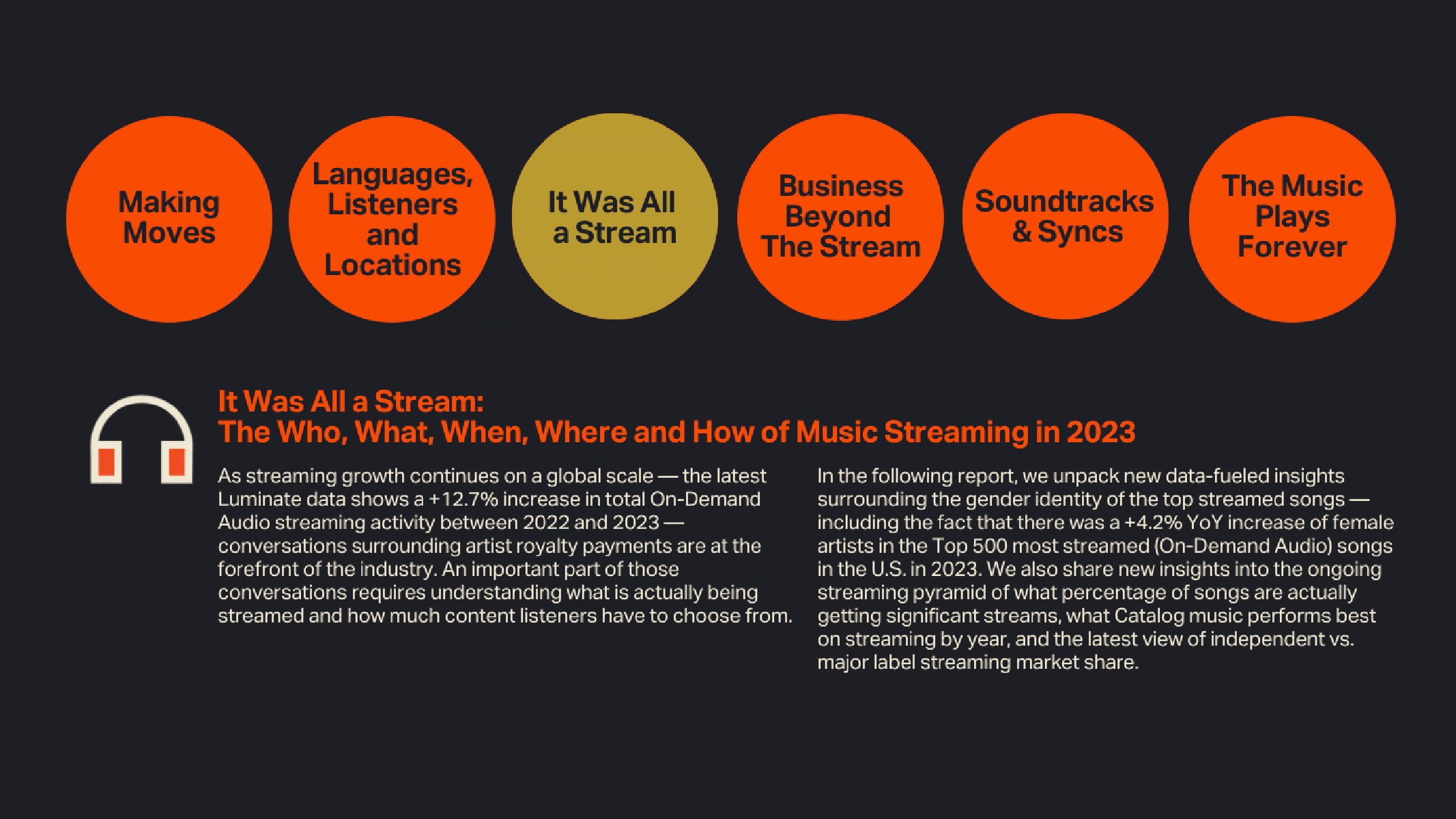 最新的Luminate数据显示,从2022年到2023年,音频点播流媒体活动总量增长了12.70%。