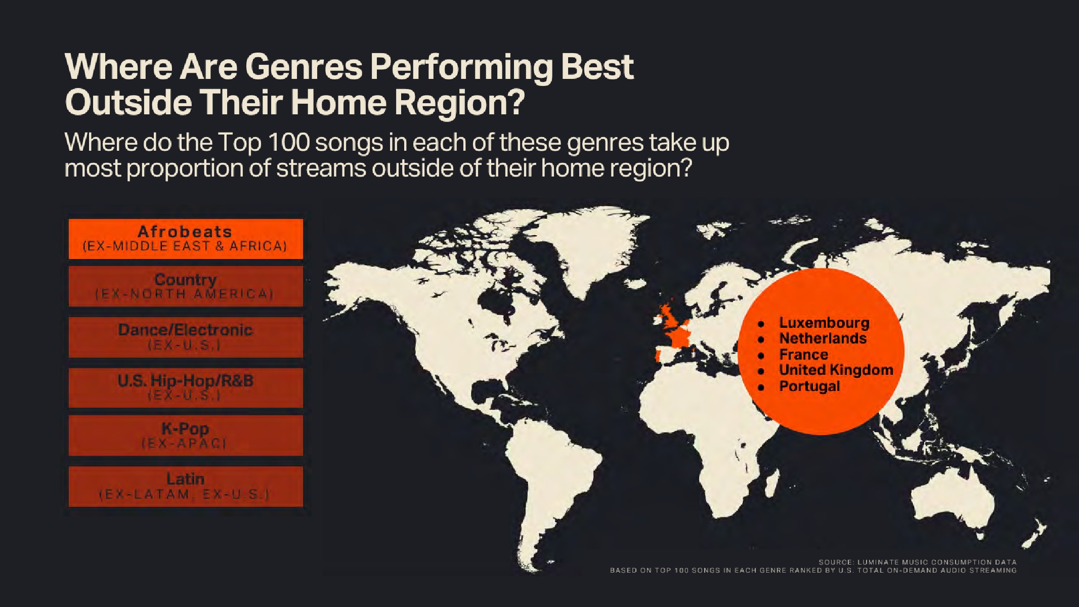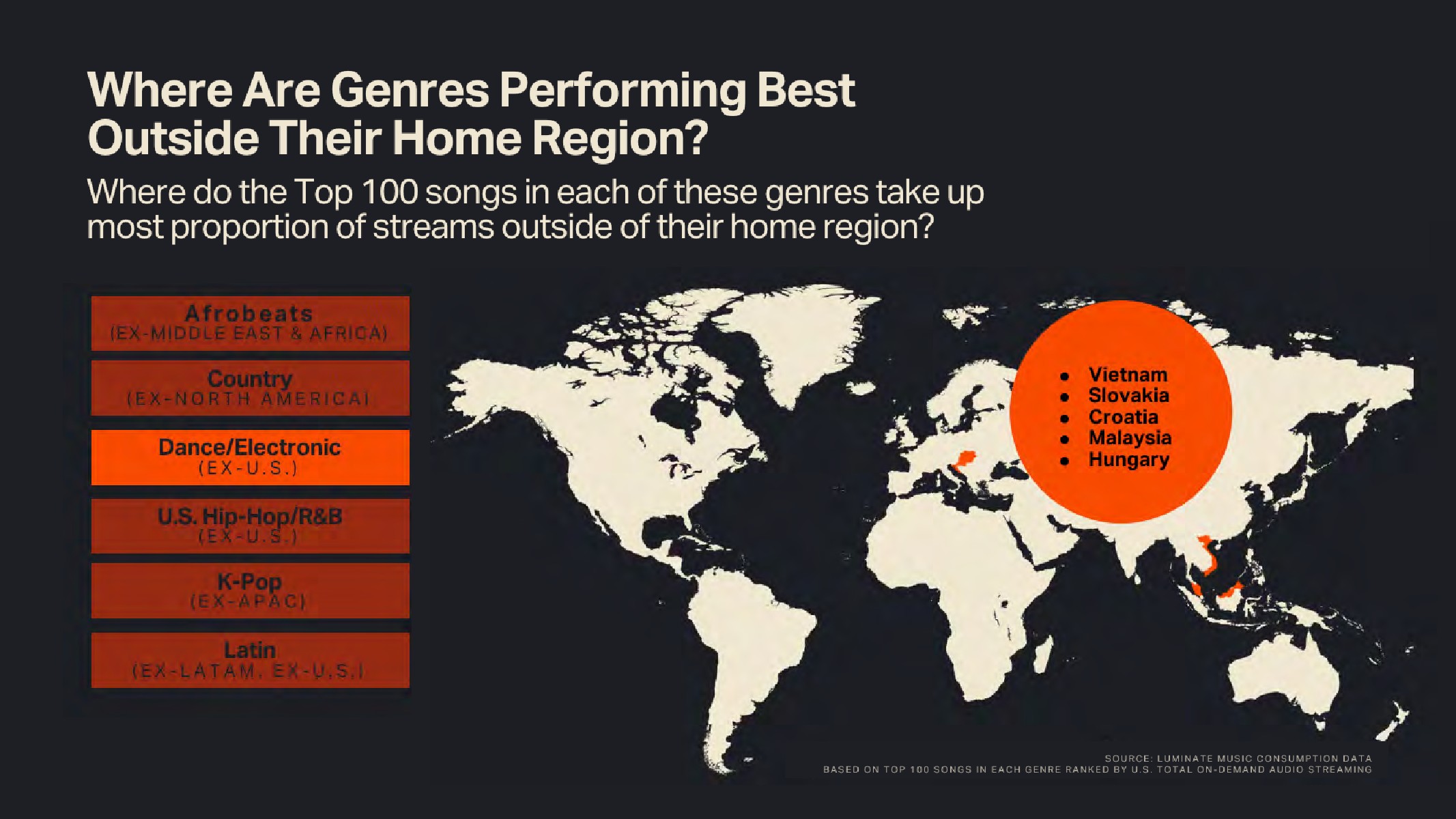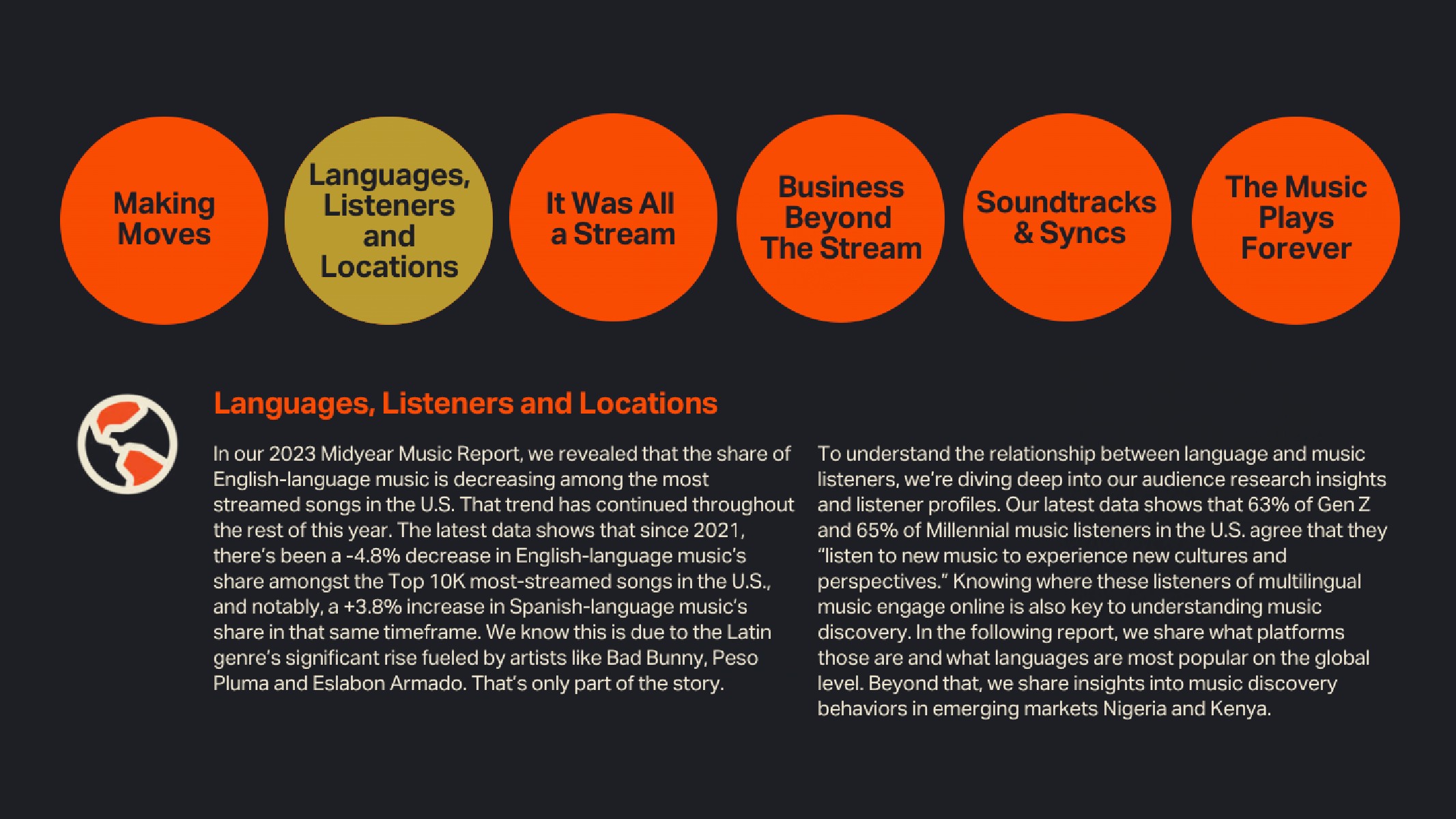 报告揭示了英语音乐在美国流量最多的歌曲中所占的份额正在下降。最新数据显示,在美国流量最大的10万首歌曲中,英语音乐的份额下降了8%。值得注意的是,西班牙语音乐的份额在同一时间段内增长了8%。