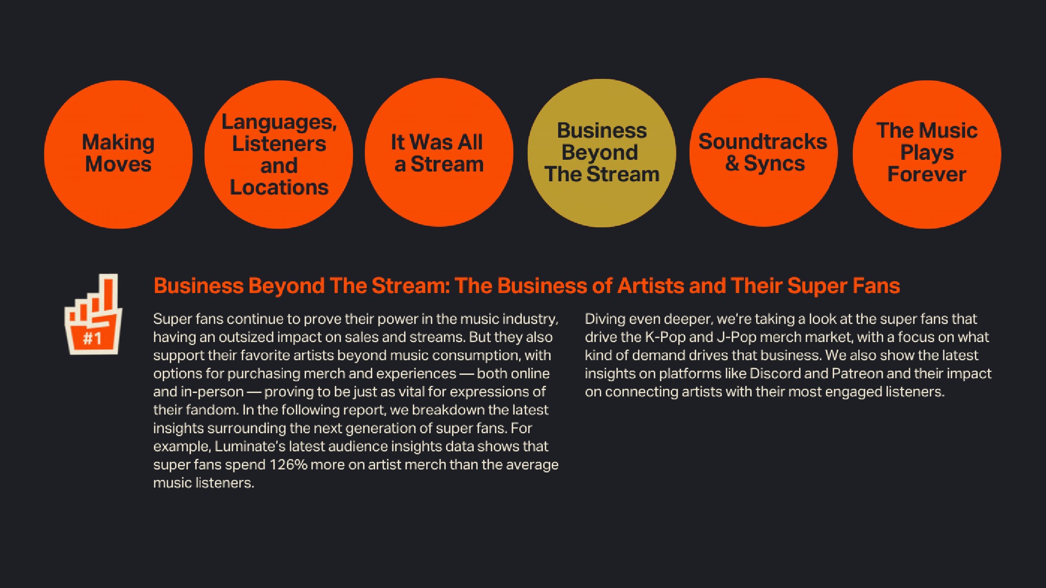 超级粉丝继续证明他们在音乐行业的力量,对销量和流媒体产生了巨大的影响。Luminate最新的受众洞察数据显示,超级粉丝在艺人商品上的花费比普通音乐听众高出126%。