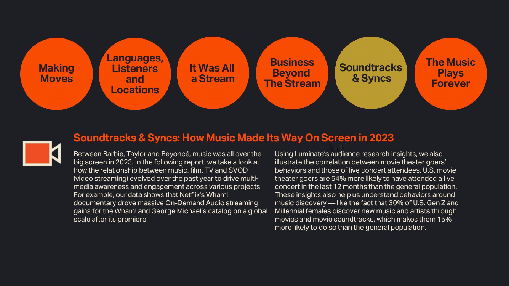 报告还说明了电影院观众行为与现场音乐会参与者行为之间的相关性。在过去的12个月里,美国电影院的观众观看现场音乐会的可能性比普通人群高54%。这些见解也有助于我们理解与音乐发现有关的行为,30%的美国Z世代和千禧一代女性通过电影和电影原声带发现新的音乐和艺术家,她们比普通人群更有可能这样做。