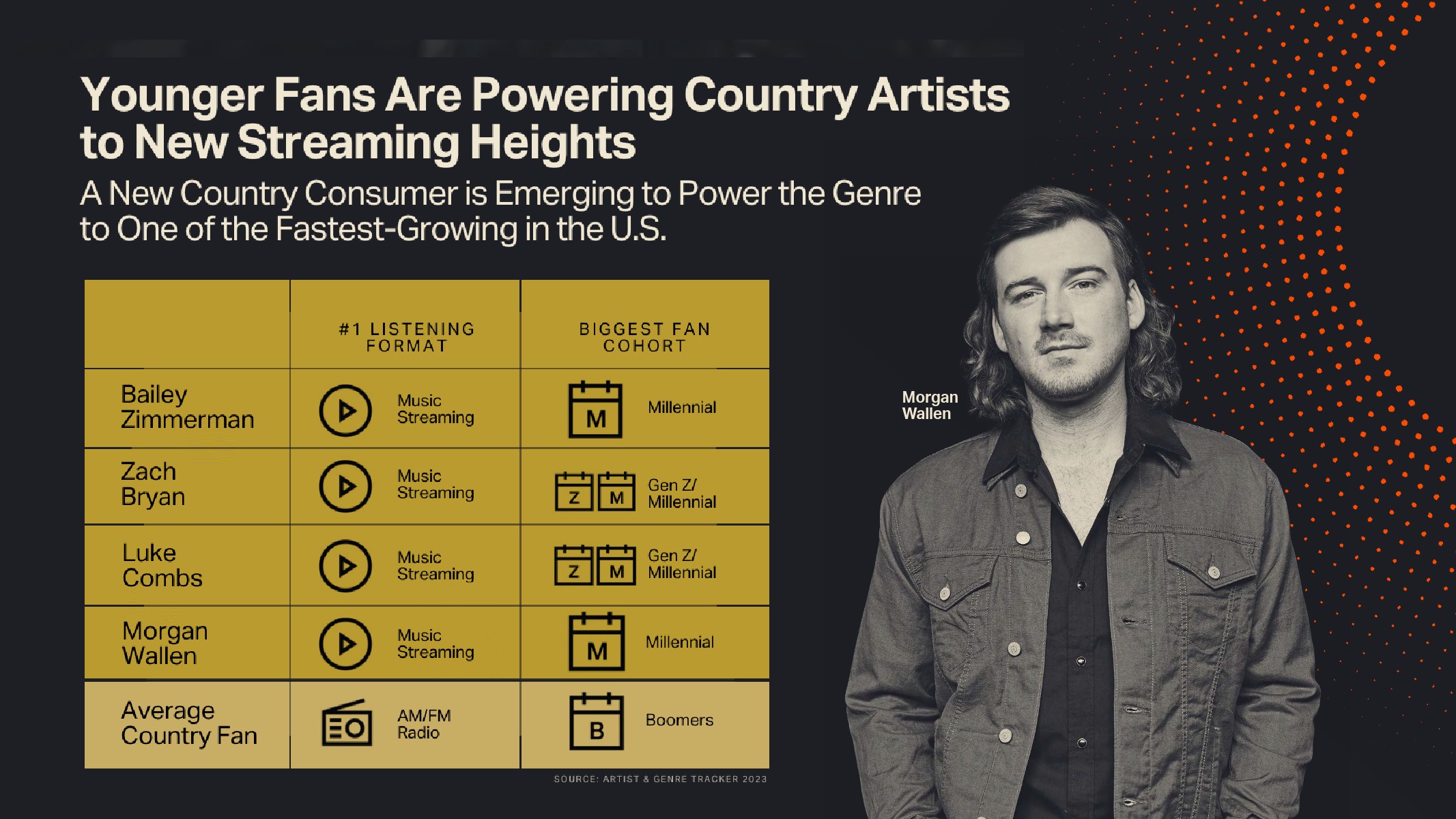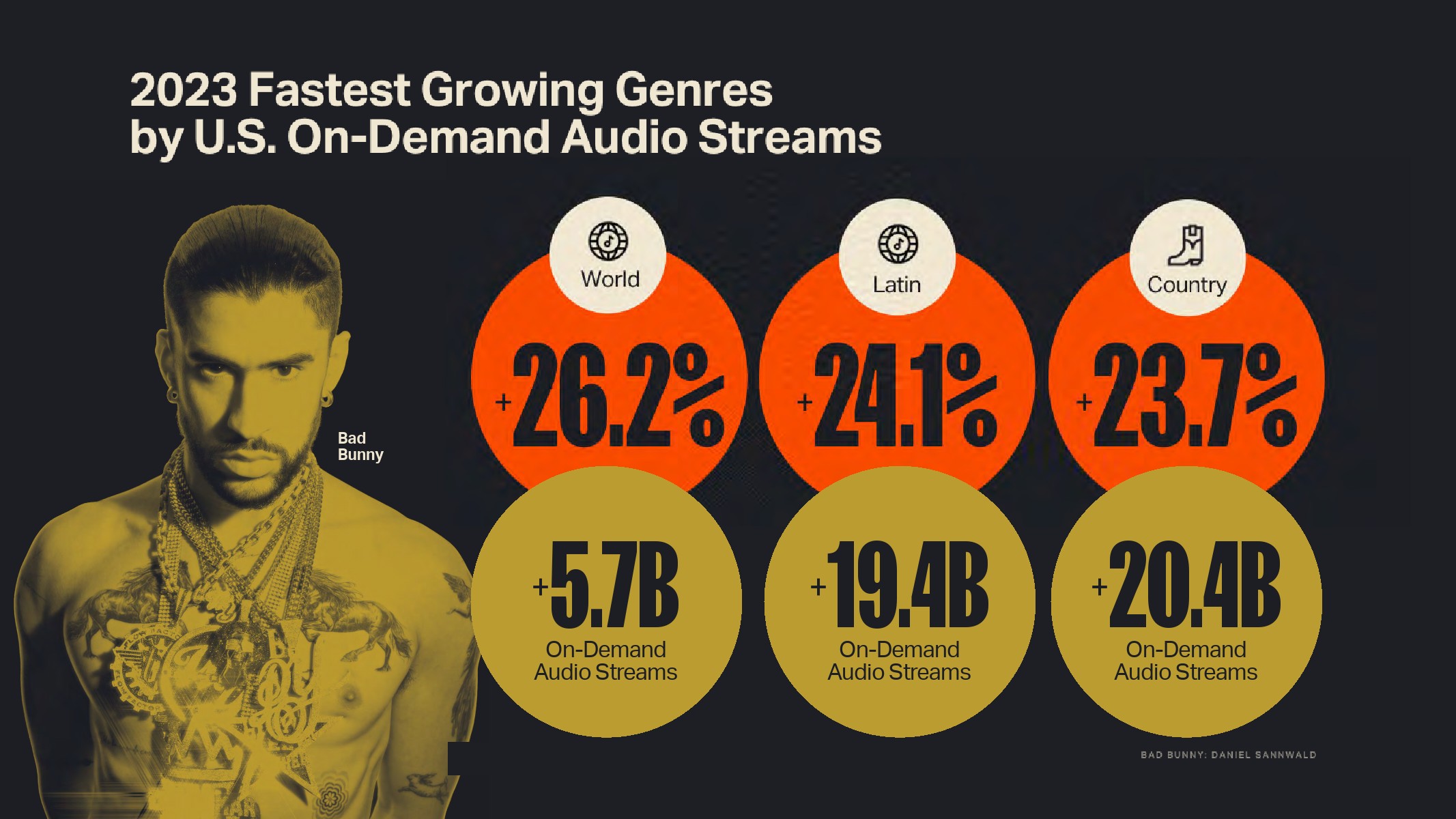 Luminate发布了“2023年年底音乐报告”。2023年是美国乡村音乐的好年份。早些时候,Morgan Wallen、 LukeCombs 和Zach Bryan等歌手发布了新专辑和热门歌曲,推动2023年乡村音乐在美国的点播流媒体周创下了有史以来的最高纪录。