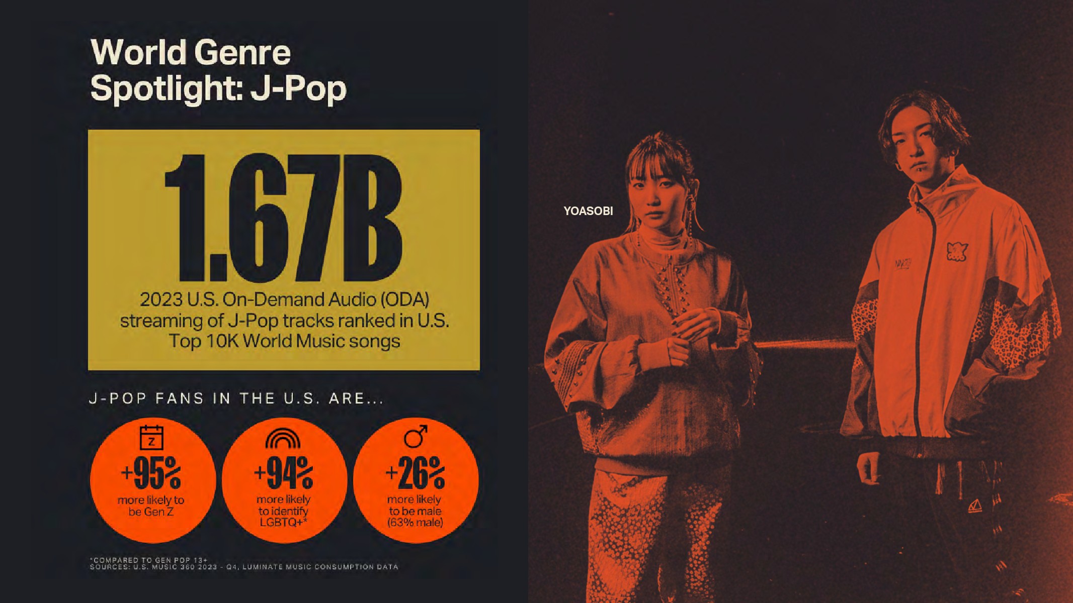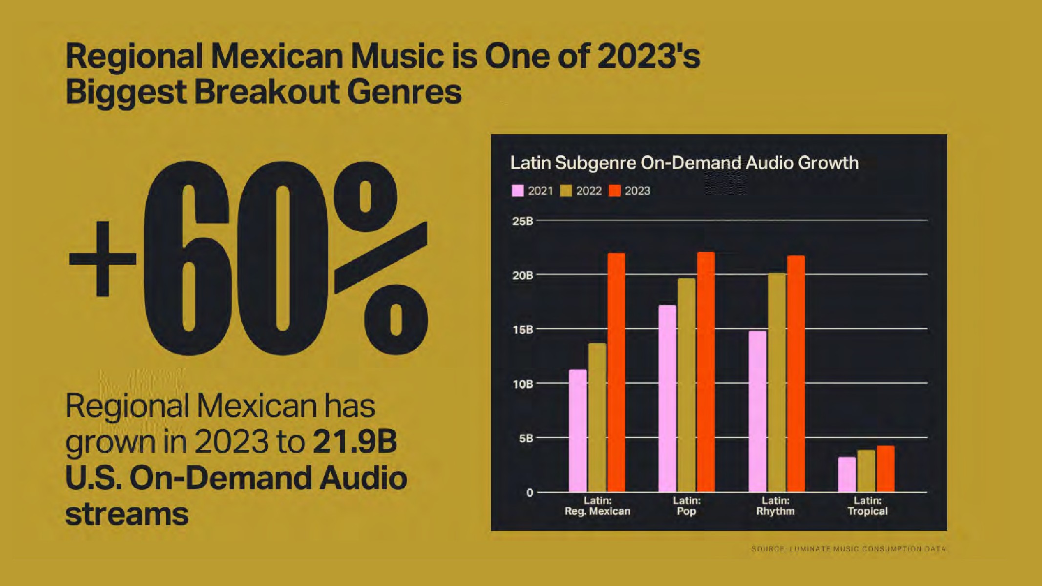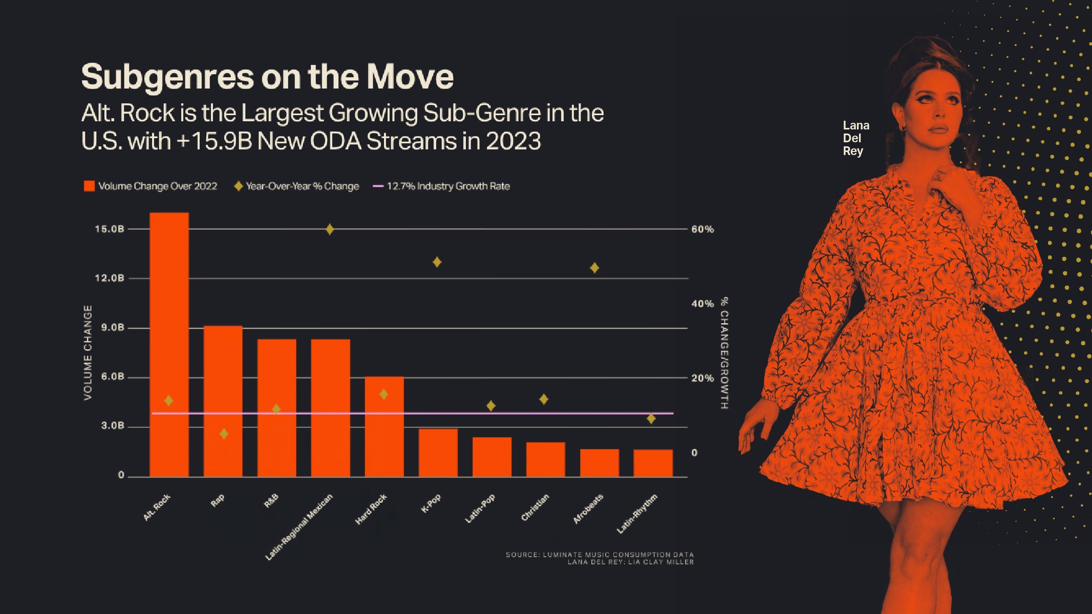 Luminate根据数据对热门歌曲的性别认同进行了分析,2023年美国前500首流媒体歌曲中由女歌手演唱的份额同比增长2%。