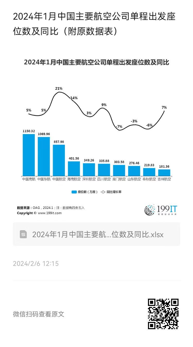 - 2024年2月中国主要航空公司单程出发座位数及同比(附原数据表)