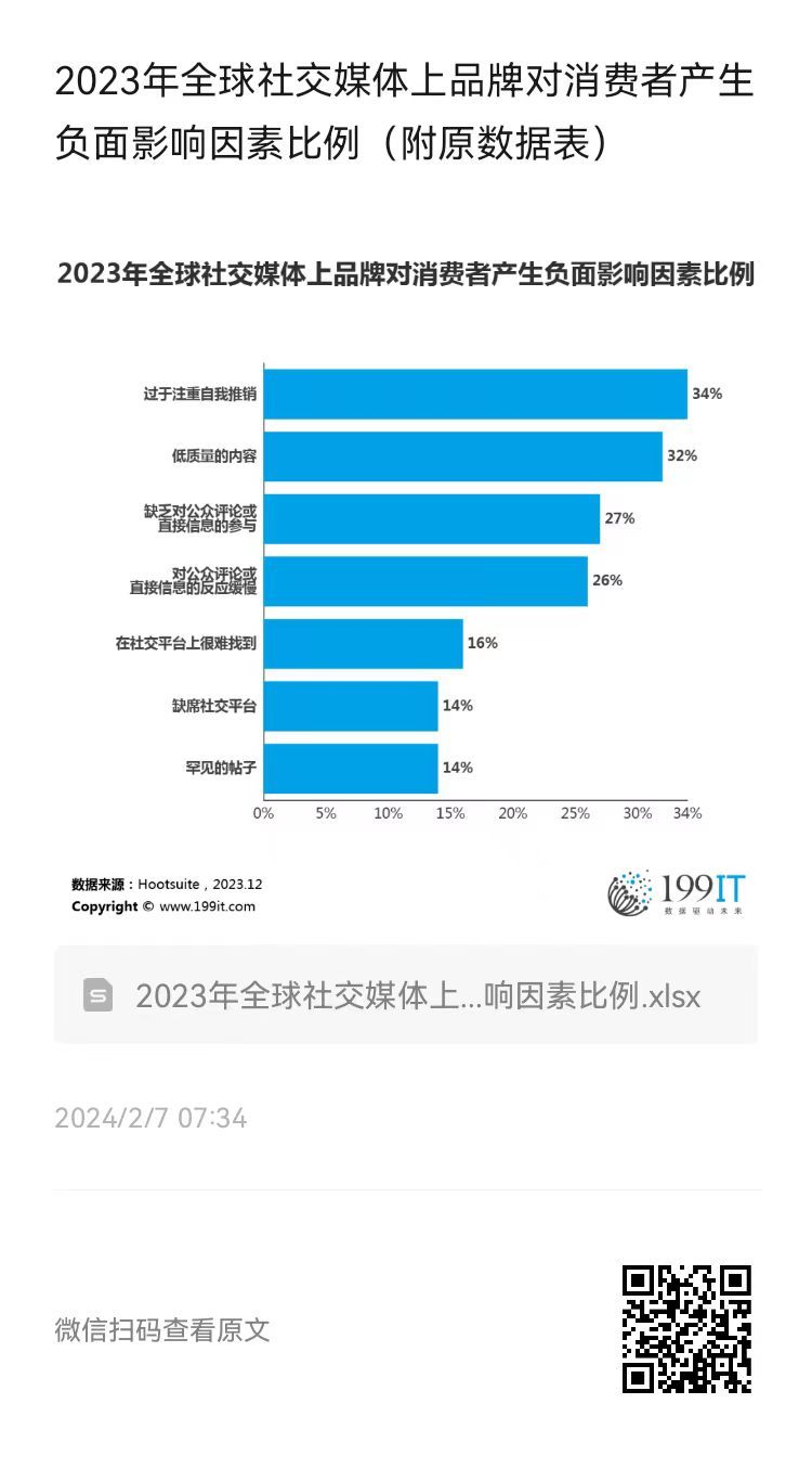 2023年全球社交媒体上品牌对消费者产生负面影响因素比例(附原数据表) 更多阅读:2020年-2025年美国12岁以上消费者使用社交媒体比例(附原数据表) 对您的品牌来说,最有效的社交媒体渠道是什么?(附原数据表) 2020-2021年美国社交媒体用户规模同比增长率(附原数据表) 2024年全球决策者对社交媒体预算支出计划预测(附原数据表) 2023年美国18-34岁听众在社交媒体发现主要音乐比例(附原数据表) 美国餐饮协会:2024年热门烹饪预测Meltwater:2025年社交媒体报告Sprout Social:2025年英国社交媒体指数报告Sprout Social:消费者对社交媒体的需求YouGov:2024年美国社交媒体报告Pathmatics:2022年欧洲社交媒体广告报告Ogilvy:2022年社交媒体趋势报告HootSuite:2022年Facebook广告统计数据走向流行:文化创作者报告Socialinsider:2021年TikTok平均参与度达到 5.96%