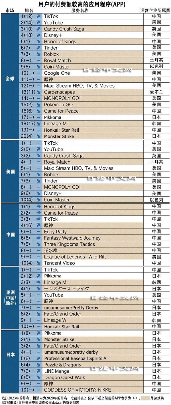 该公司统计了谷歌应用商店“Google Play”和苹果应用商店“App Store”的APP内付费金额进行估算,在中国仅统计了App Store的金额,并最终得出排名。
