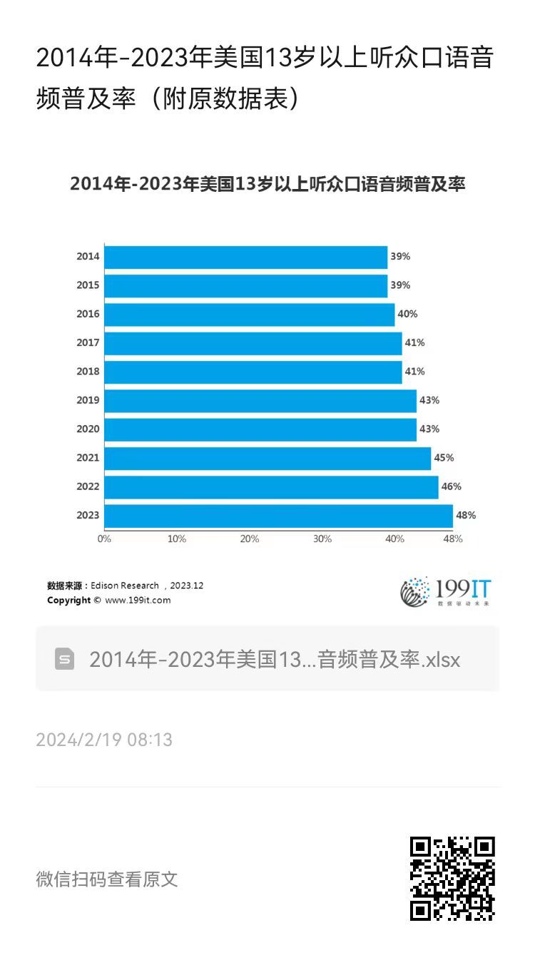 2014年-2023年美国13岁以上听众口语音频普及率(附原数据表) ​​​