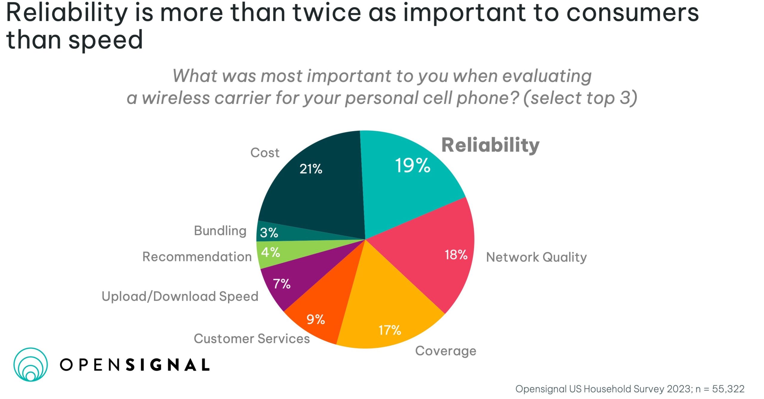 根据Opensignal对55,322名美国人的调查,19%的受访者认为可靠性是评估运营商的关键因素;只有7%的受访者认为是上传/下载速度。