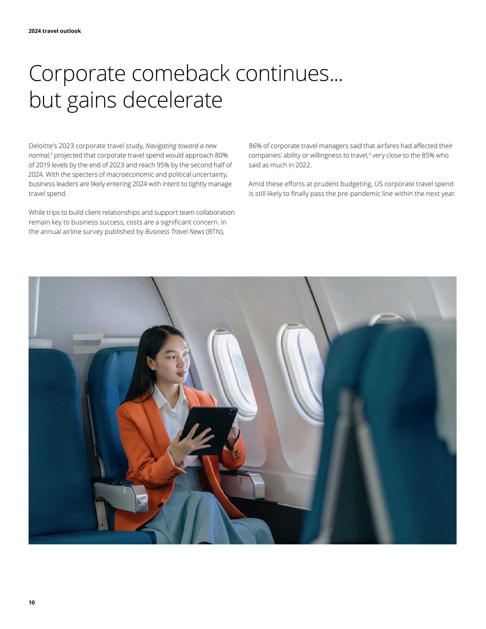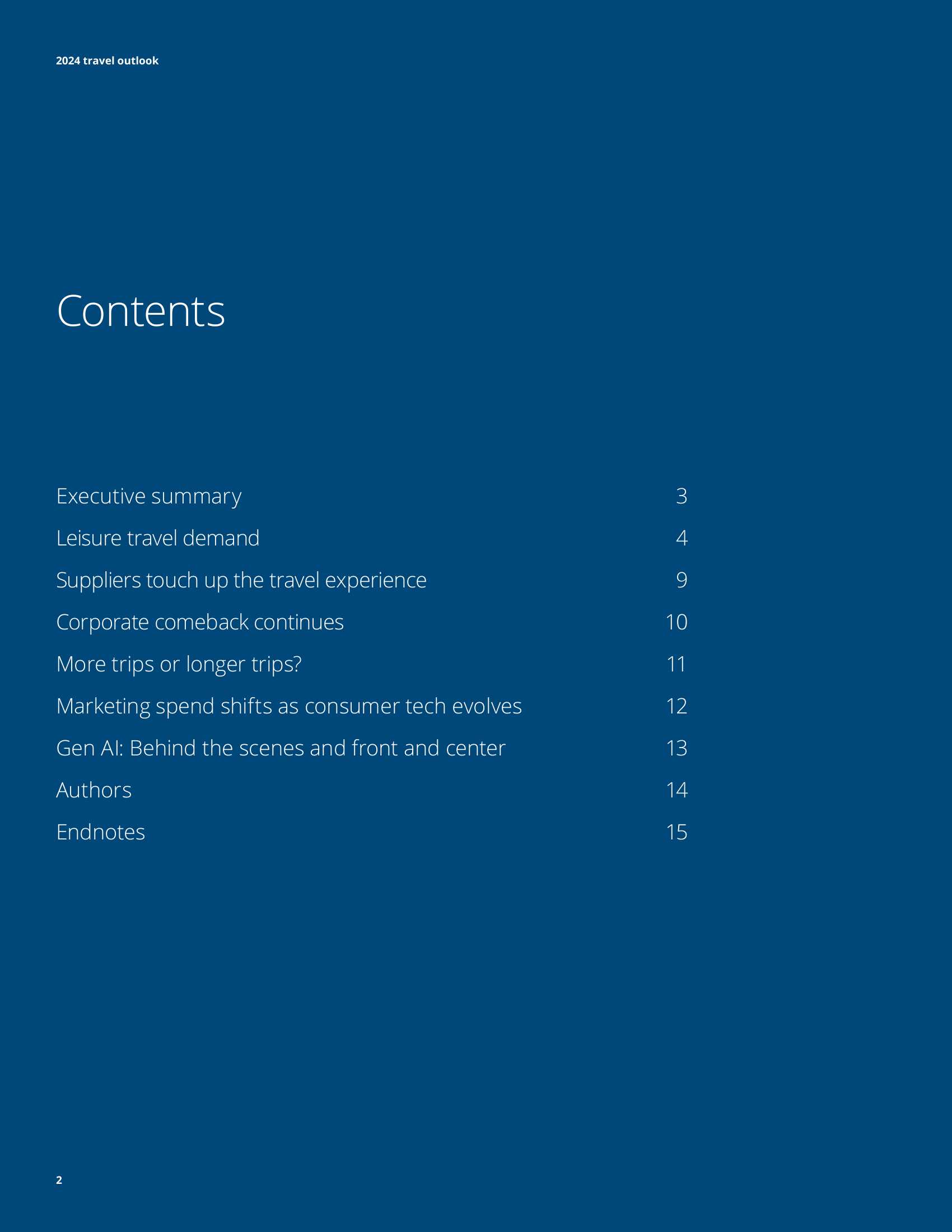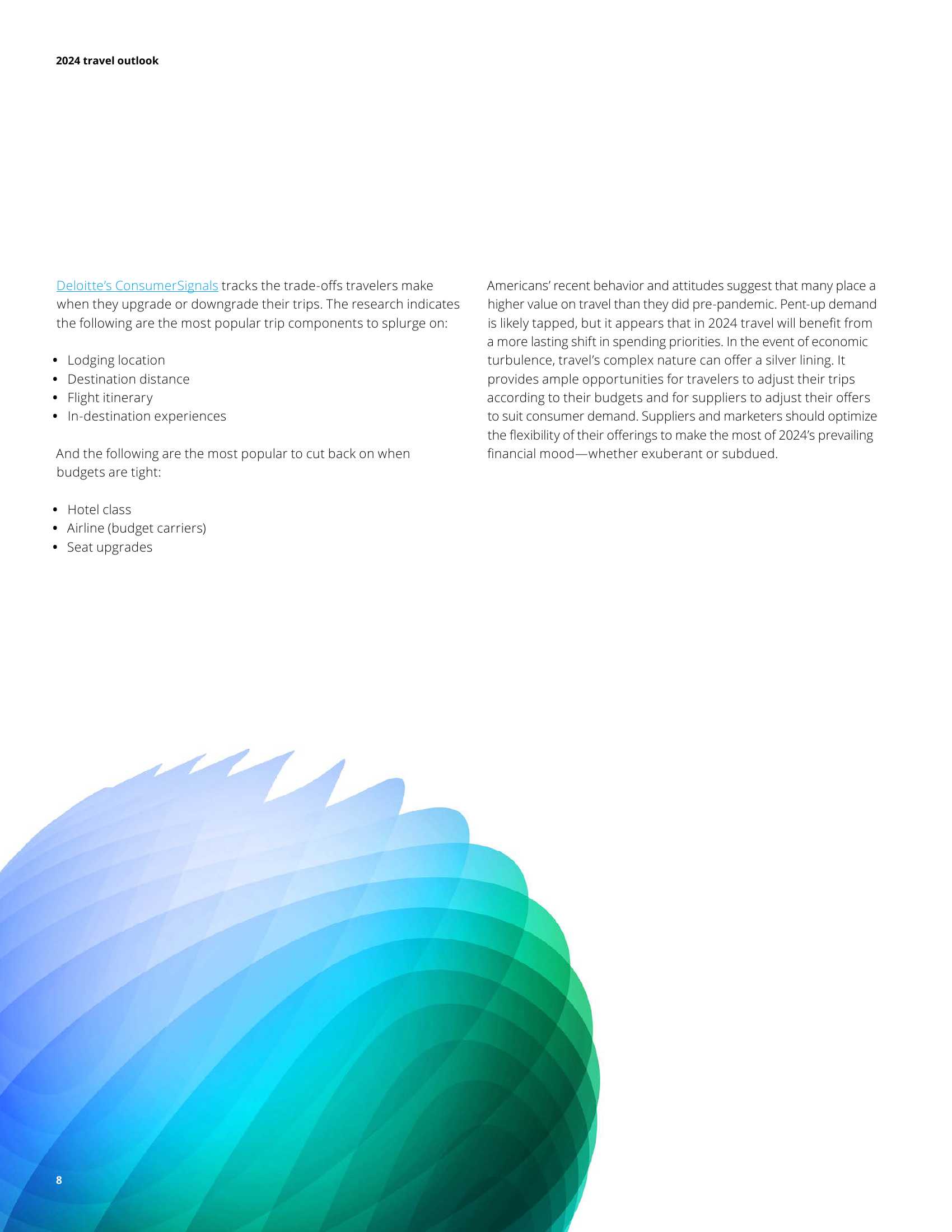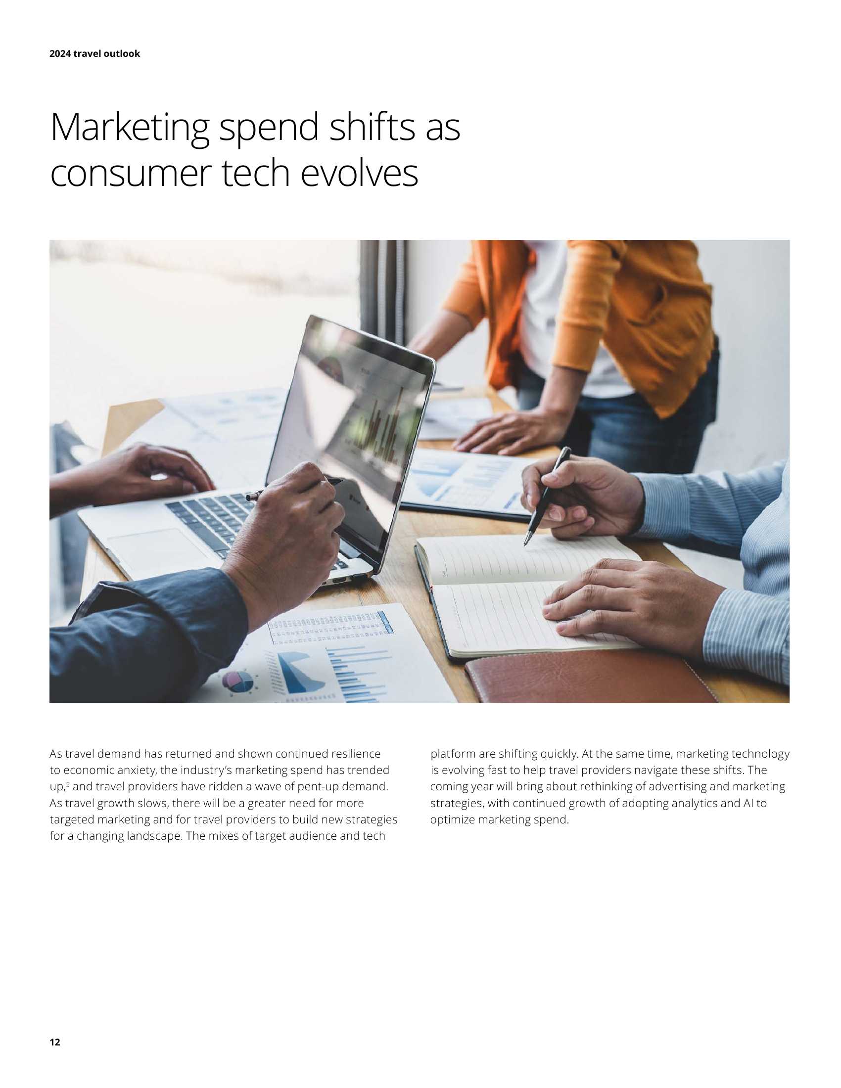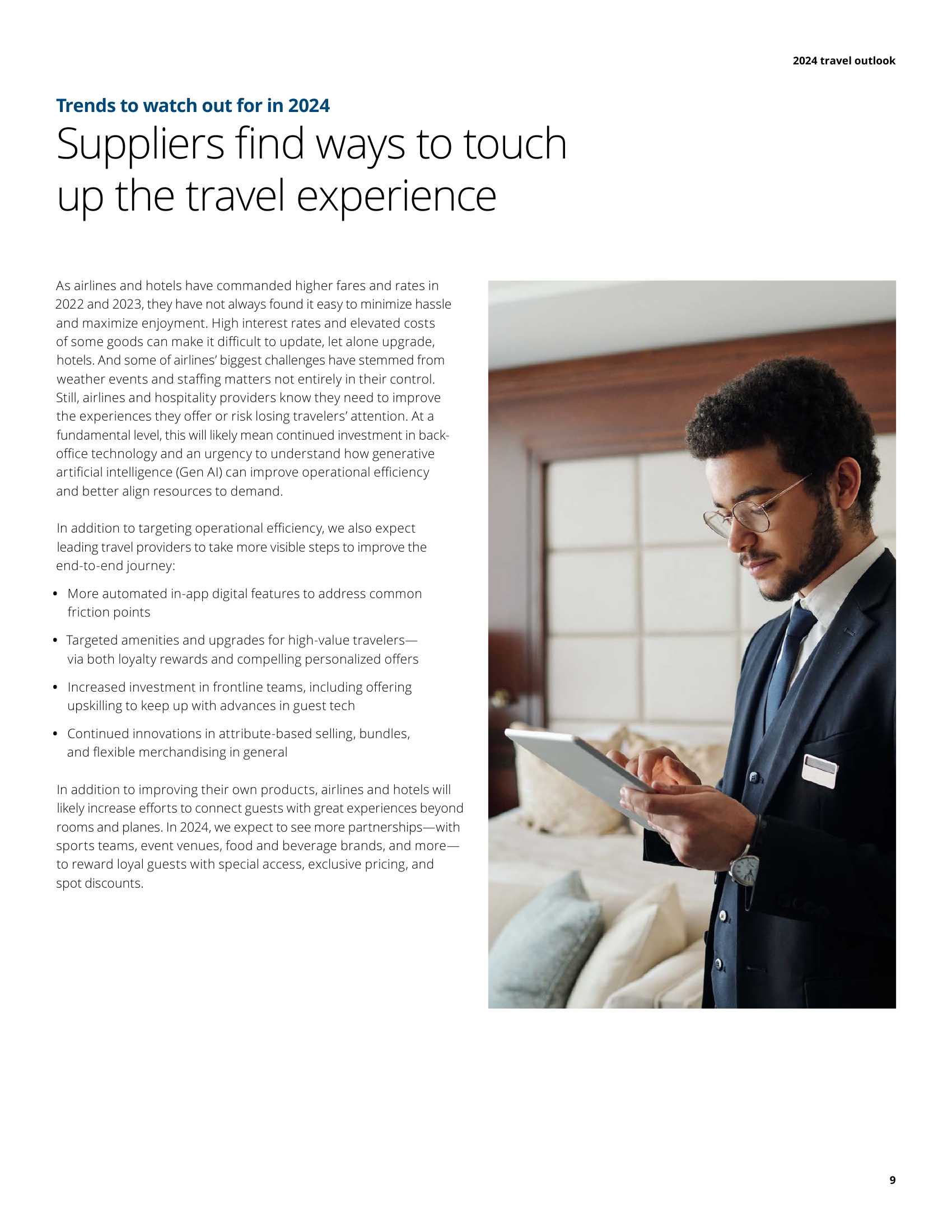 尽管前景乐观,但经济衰退可能会导致更保守的旅游行为,尤其是在低收入群体中。旅行频率和某些嗜好可能会下降。与此同时,如果高收入群体相对不受经济逆风的影响,那么高端旅游产品今年的表现可能会好于廉价旅游产品。在企业方面,许多决策者在来年将在保守的预算和追求差旅带来的战略效益之间寻求微妙的平衡。2024年,旅游供应商可能会看到对不同产品和设施的需求出现大幅波动。那些能够运用科技提供个性化和灵活服务的公司,将充分利用机会,使旅行成为一种广受珍视的体验。