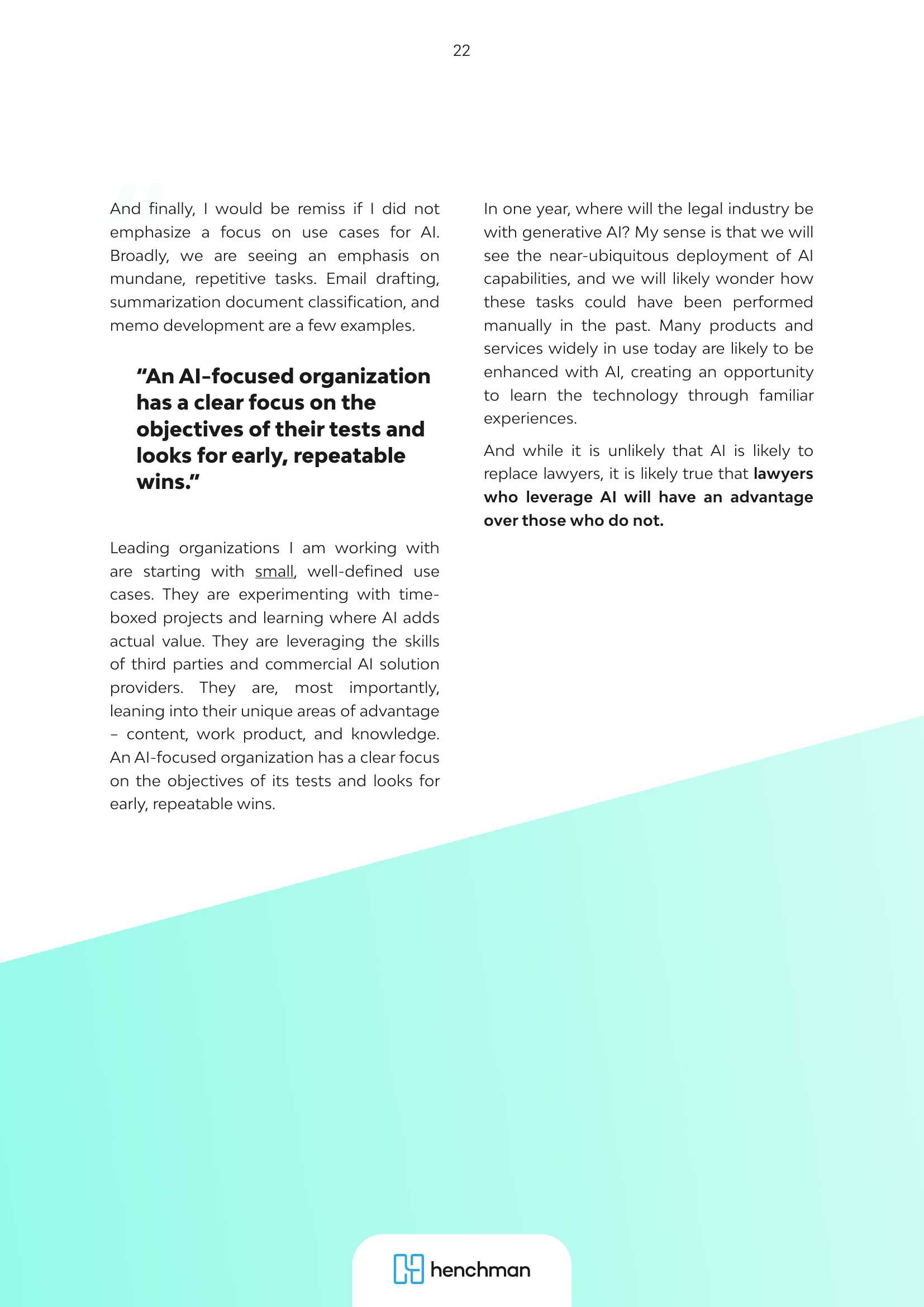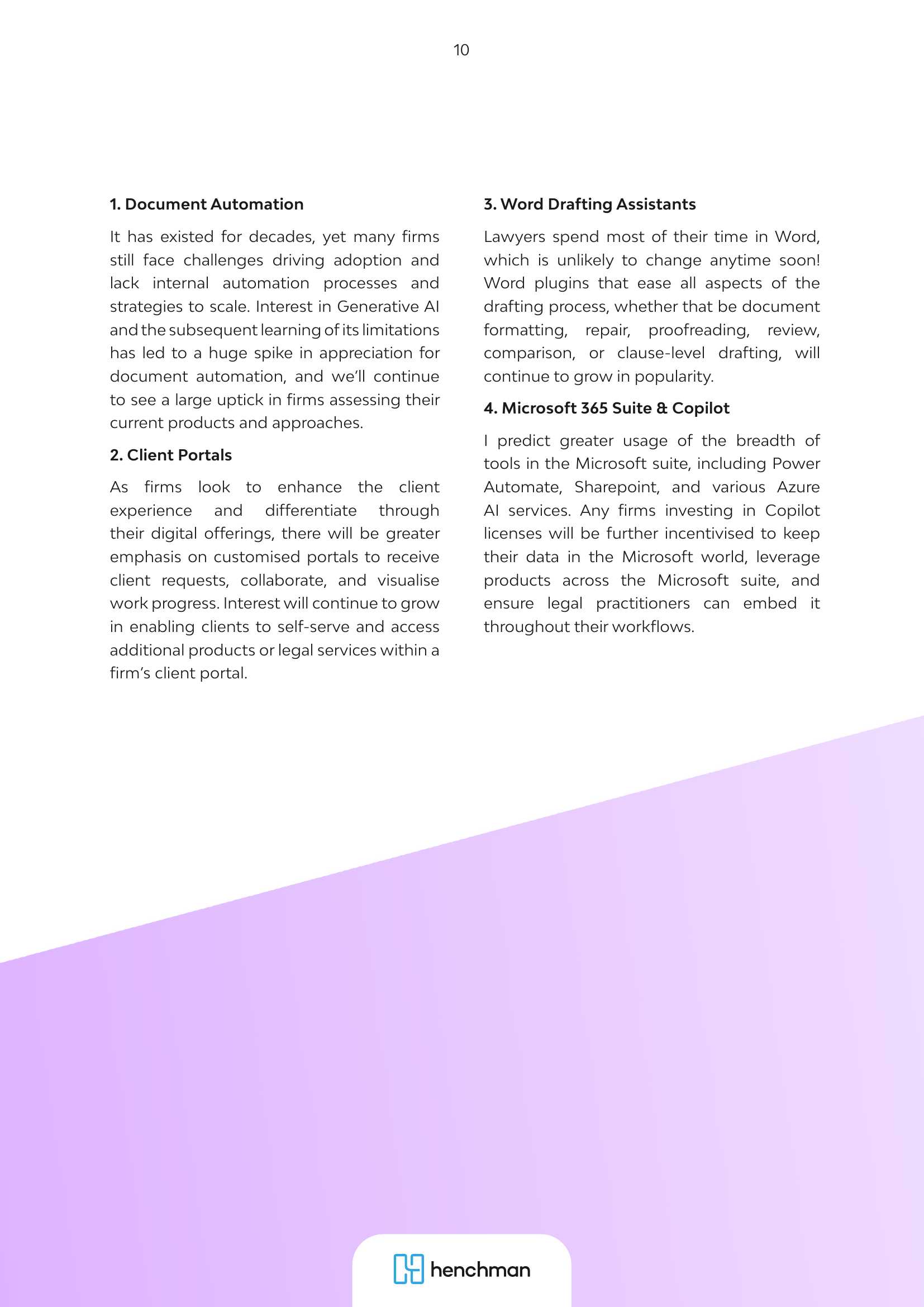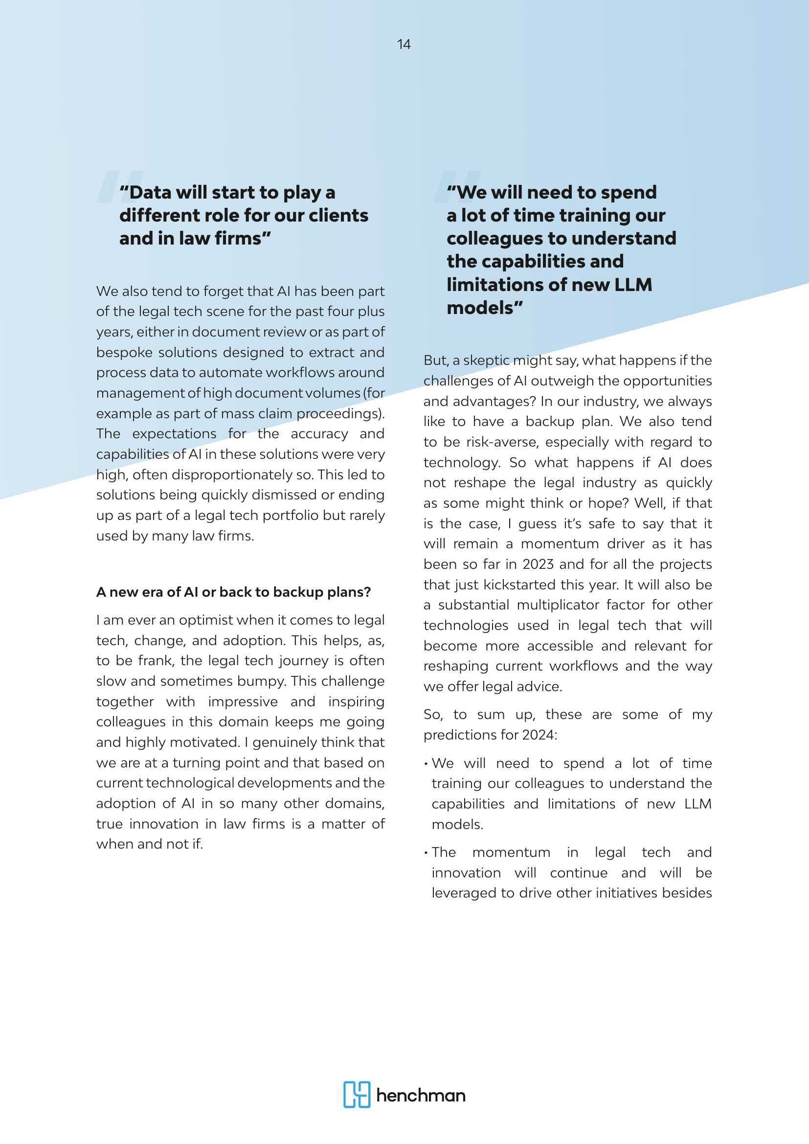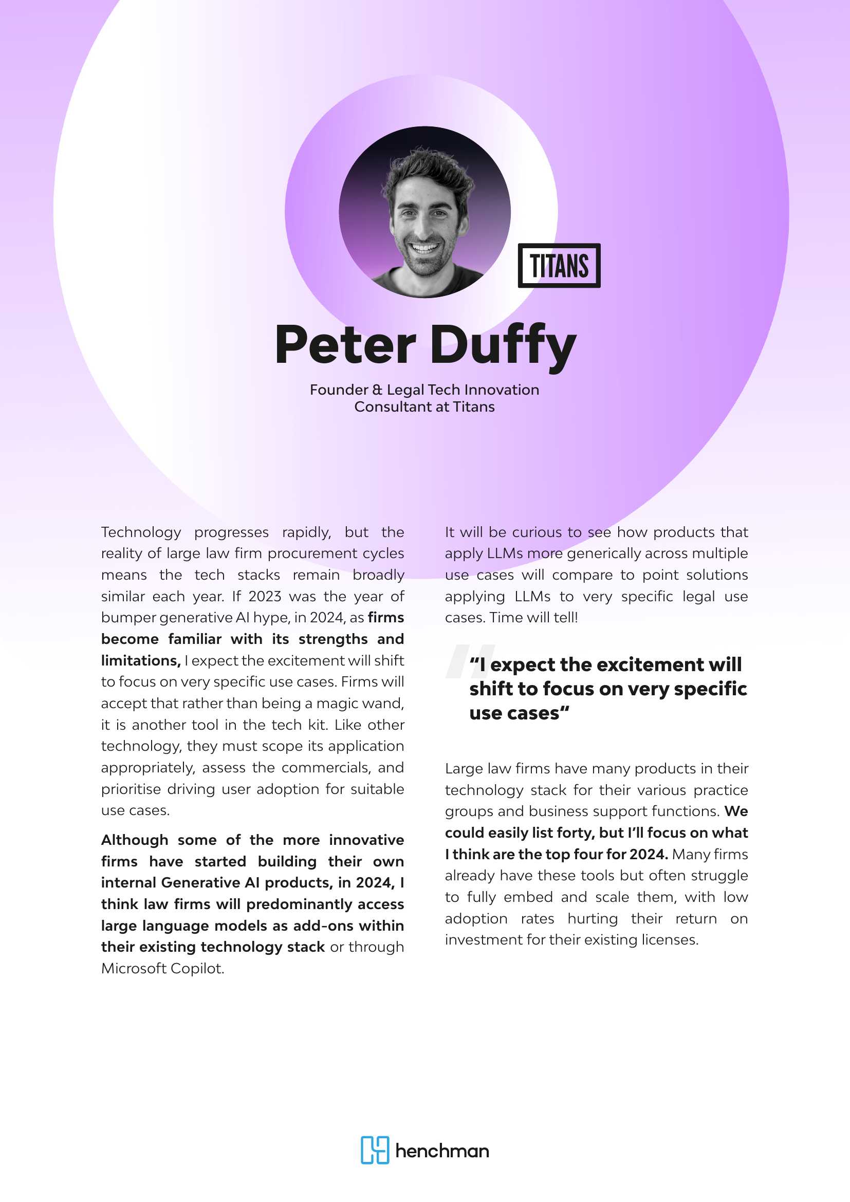 技术进步迅速,但大型律师事务所采购周期的现实意味着,每年的技术堆栈大致相似。如果2023年是人工智能大肆宣传的一年,那么2024年,随着公司对其优势和局限性的熟悉,预计兴奋将转移到非常具体的用例上。企业将接受这一点,即它不是一根魔杖,而是技术工具包中的另一个工具。像其他技术一样,他们必须适当地界定其应用范围,评估商业价值,并优先考虑推动用户采用合适的用例。