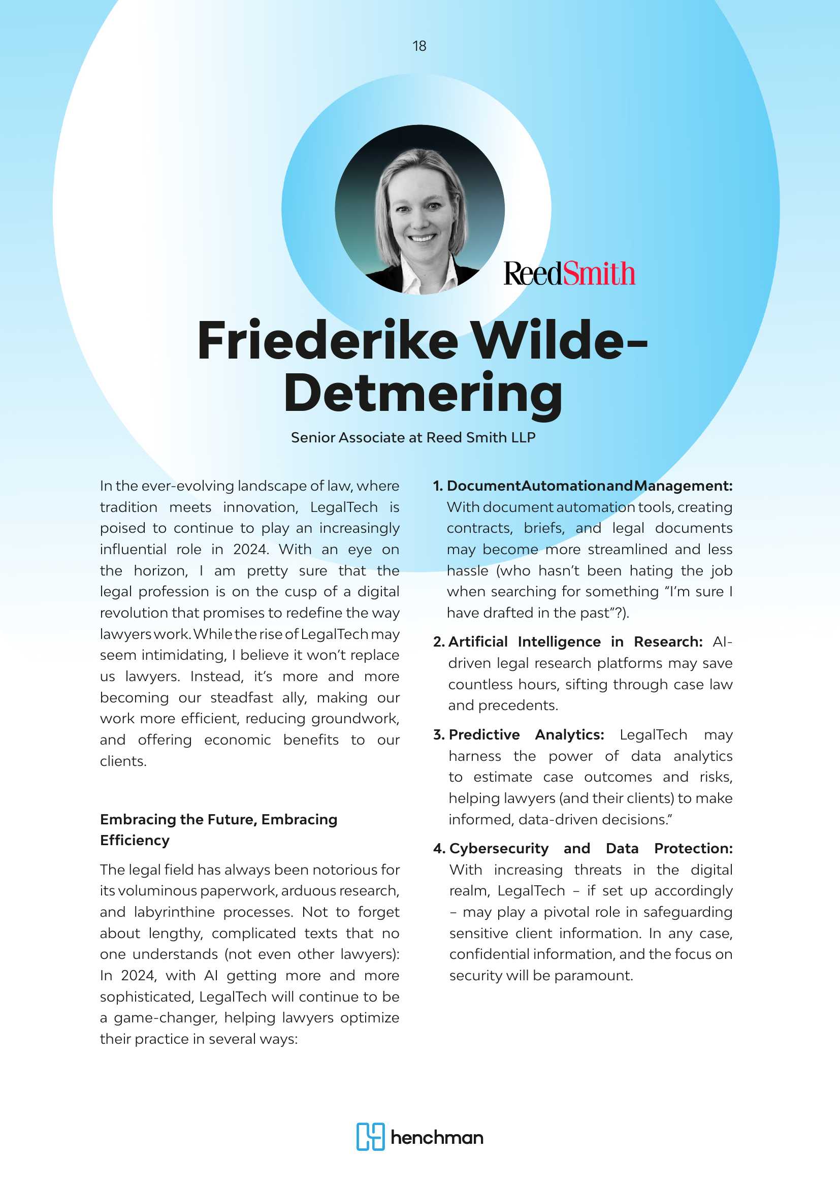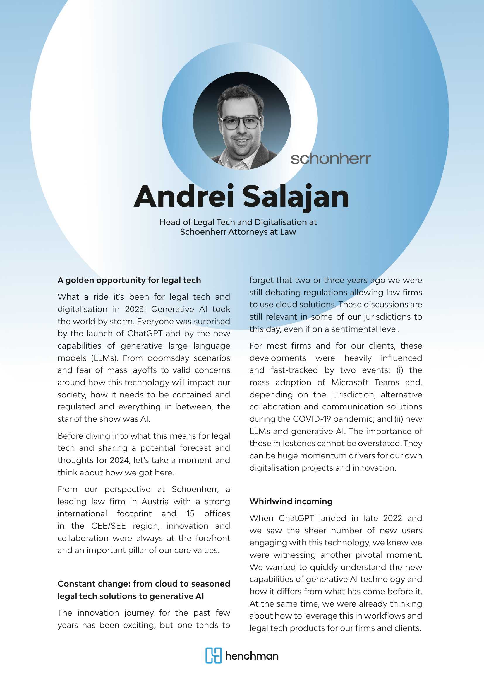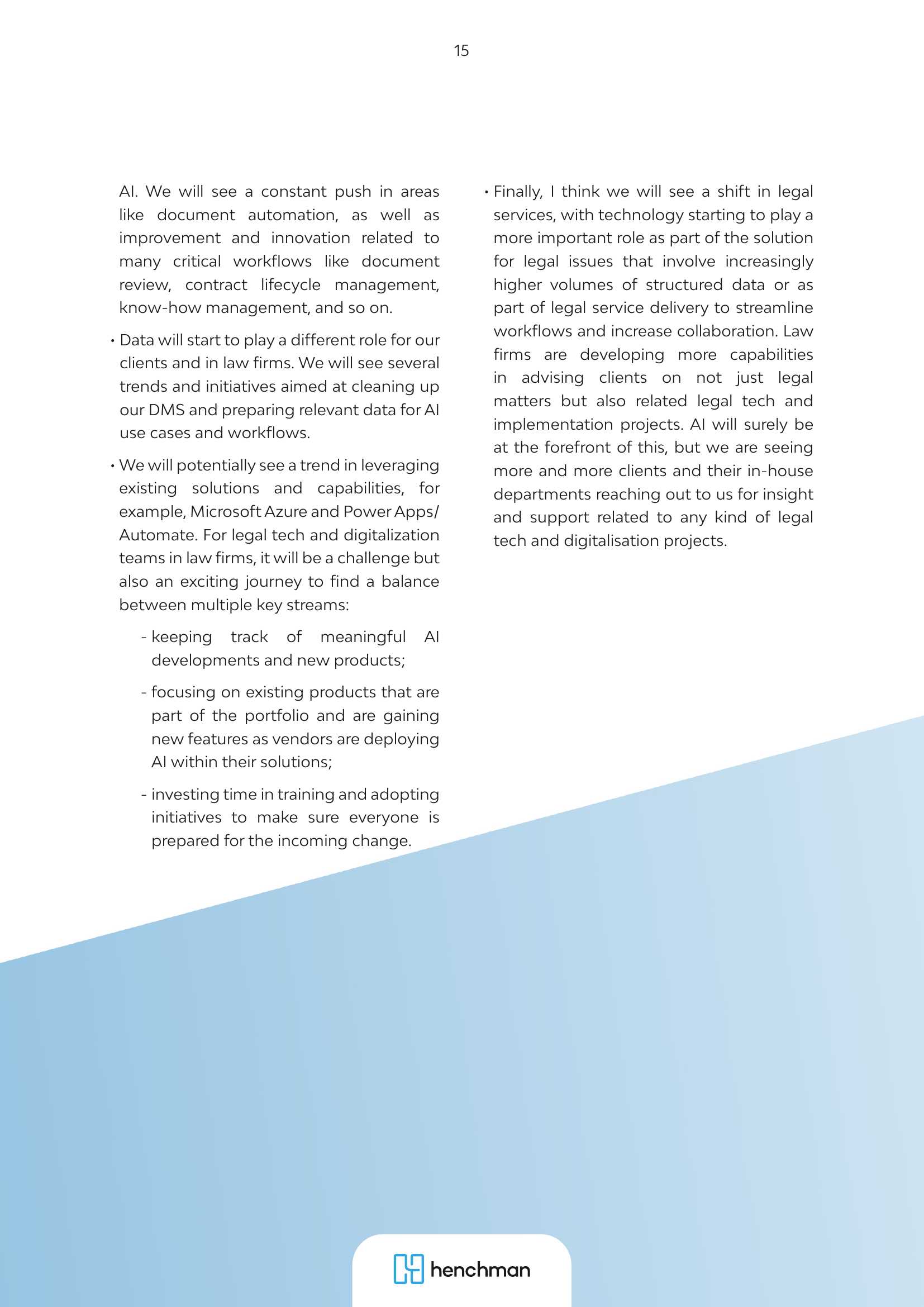 技术进步迅速,但大型律师事务所采购周期的现实意味着,每年的技术堆栈大致相似。如果2023年是人工智能大肆宣传的一年,那么2024年,随着公司对其优势和局限性的熟悉,预计兴奋将转移到非常具体的用例上。企业将接受这一点,即它不是一根魔杖,而是技术工具包中的另一个工具。像其他技术一样,他们必须适当地界定其应用范围,评估商业价值,并优先考虑推动用户采用合适的用例。
