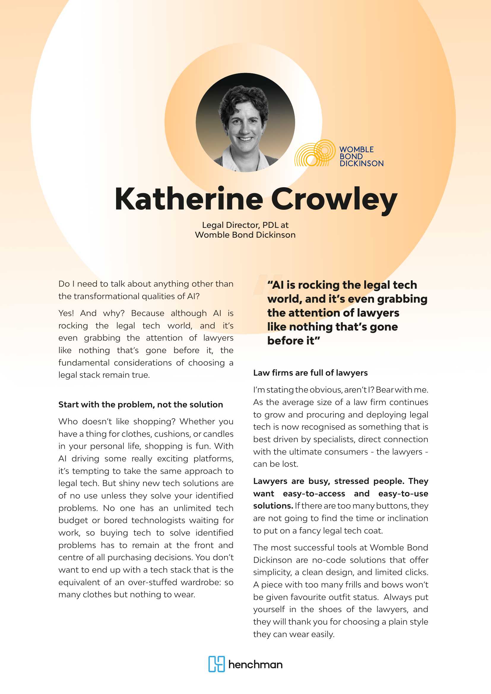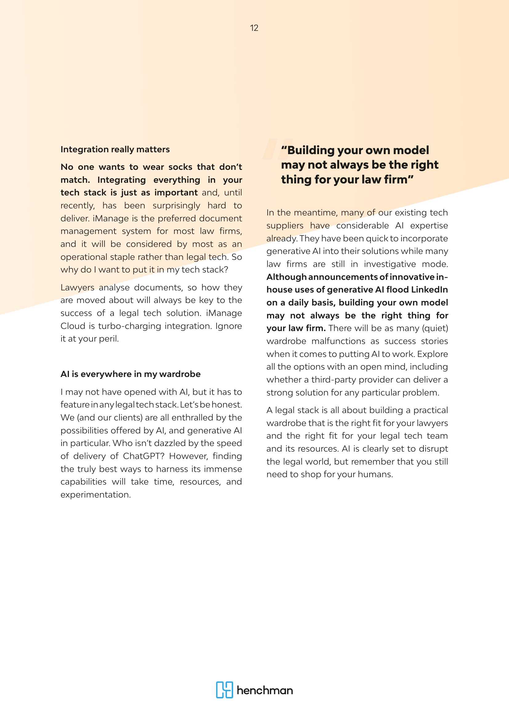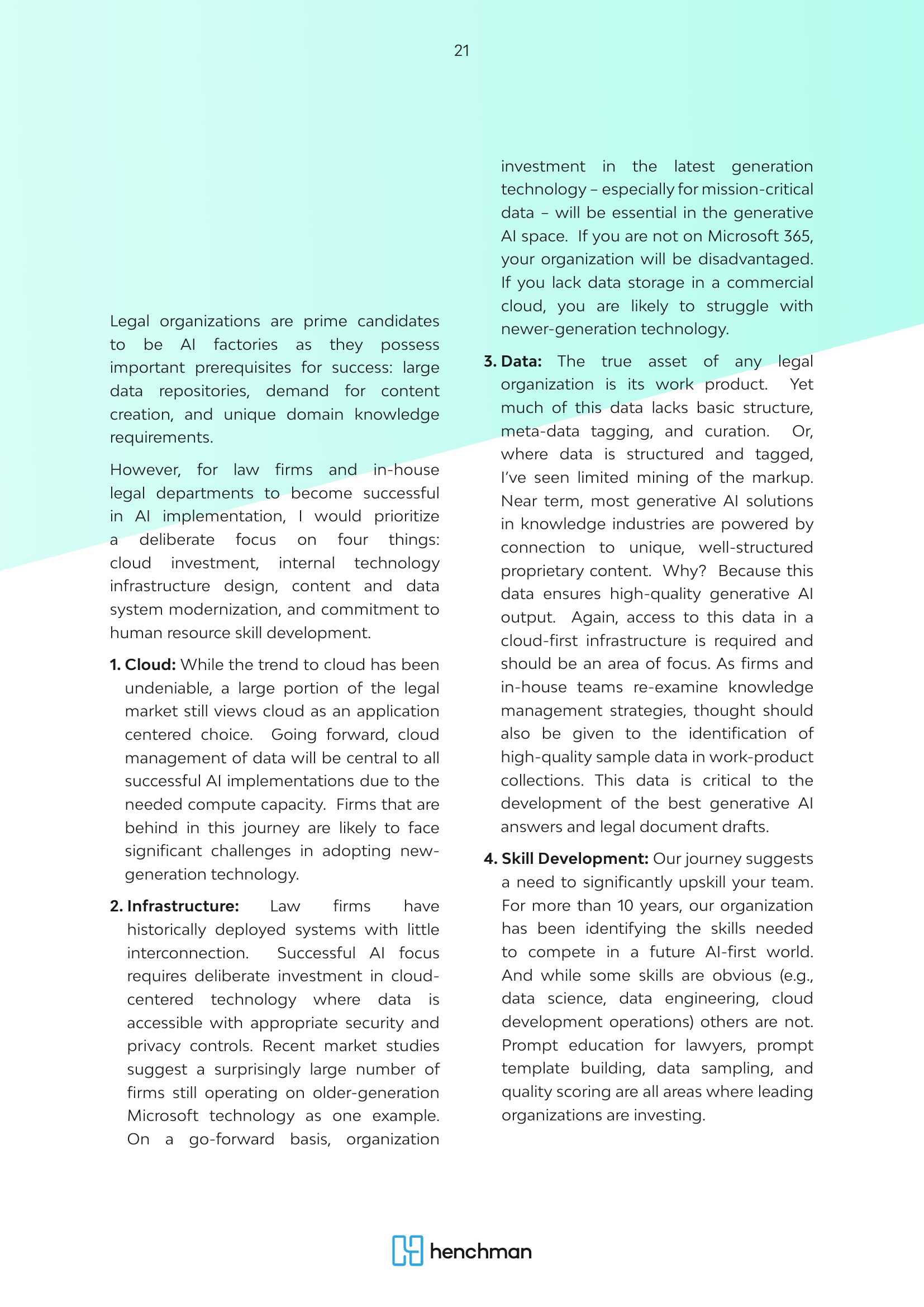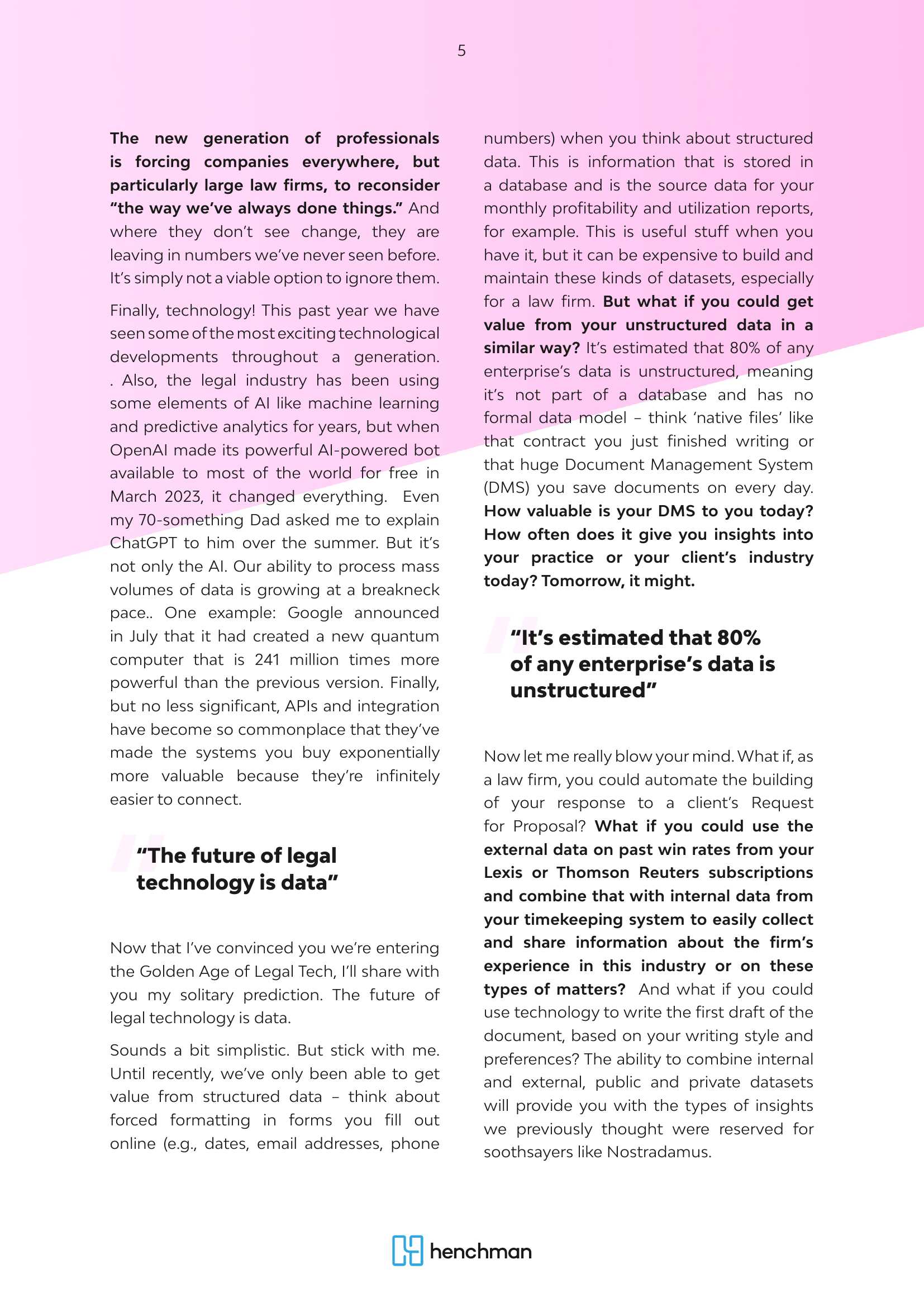 技术进步迅速,但大型律师事务所采购周期的现实意味着,每年的技术堆栈大致相似。如果2023年是人工智能大肆宣传的一年,那么2024年,随着公司对其优势和局限性的熟悉,预计兴奋将转移到非常具体的用例上。企业将接受这一点,即它不是一根魔杖,而是技术工具包中的另一个工具。像其他技术一样,他们必须适当地界定其应用范围,评估商业价值,并优先考虑推动用户采用合适的用例。