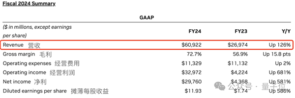 扛把子的数据中心营收占据184亿美元,比第三季度增长27%,比上一年飙升409%。2024财年全年营收也出来了:609亿美元(约合4384亿人民币),比去年多了126%。