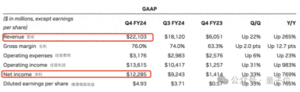 024财年Q4季度营收达221亿美元(净利122亿美元),比上一季度增长22%,比上一年增长265%。