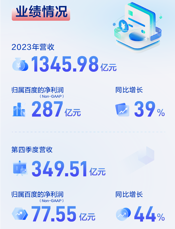 2023年全年,百度总收入为人民币1346亿元,同比增长9%,其中爱奇艺收入319亿元;非公认会计准则下净利润287亿元,同比增长了39%。