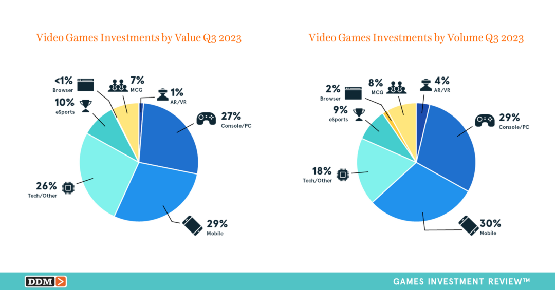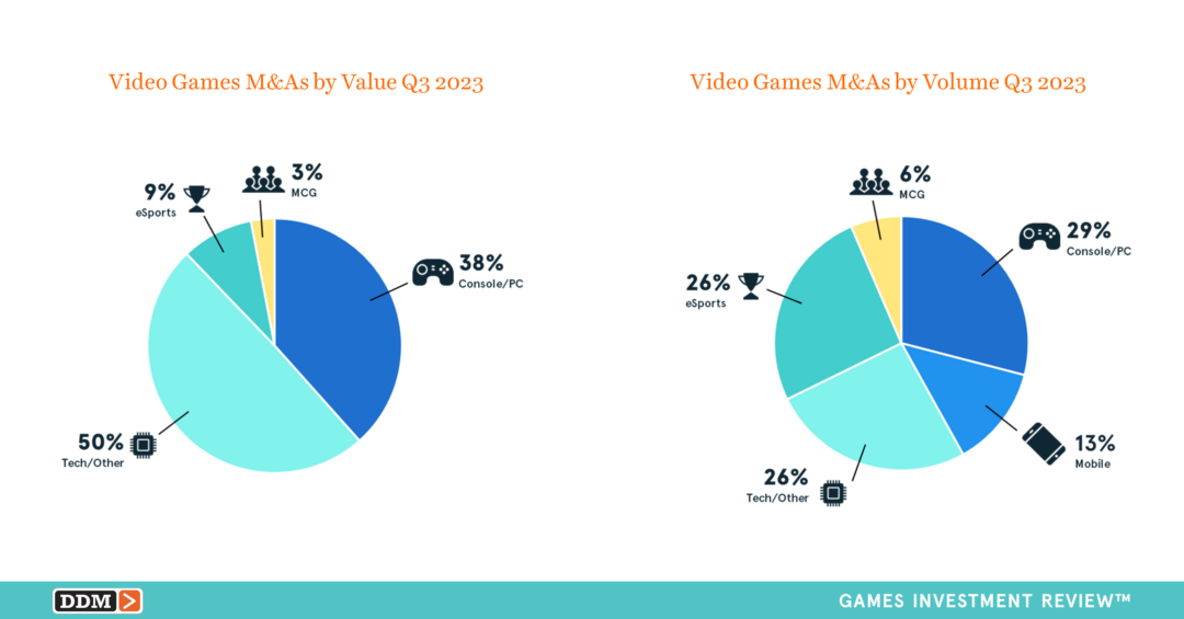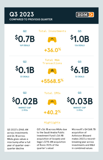 2023年第三季度30笔交易的并购总额为61亿美元(与第二季度33笔交易,价值1.084亿美元相比,价值增长5569%,交易量下降9%)。沙特阿拉伯的公共投资基金(Public Investment Fund)以49亿美元收购Scopely,世嘉(Sega)以7.704亿美元收购Rovio(占季度价值的92%),以及大量未披露条款的交易,推动了这一数字增长56倍。