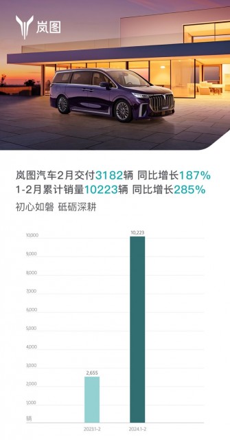 岚图汽车率先公布2024年2月交付数据。2月,岚图汽车交付新车3182辆,同比增长187%,1-2月累计销量10223辆,同比增长285%。