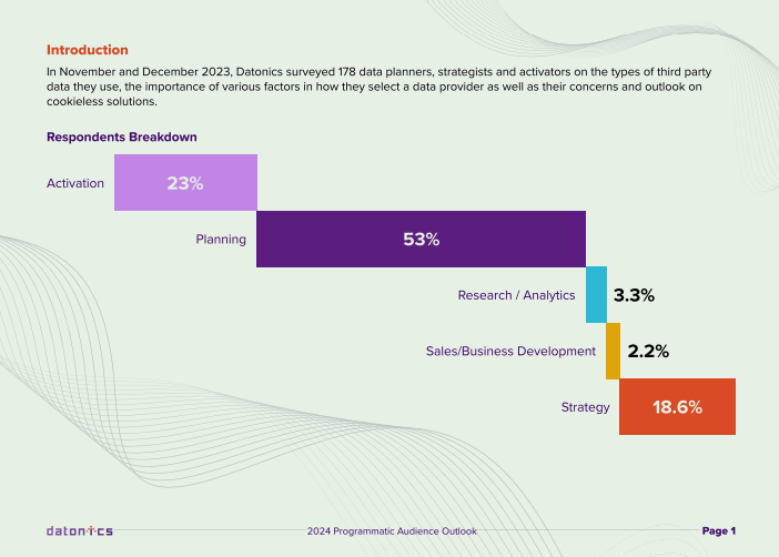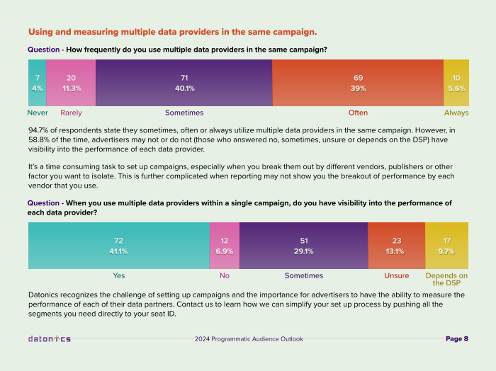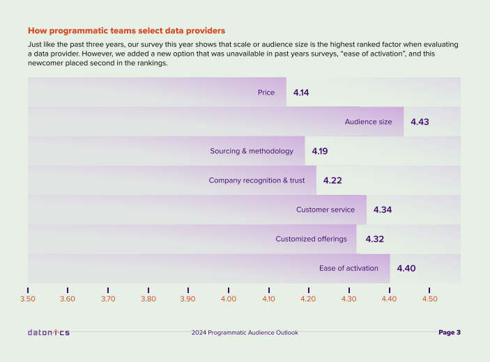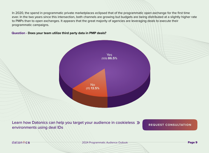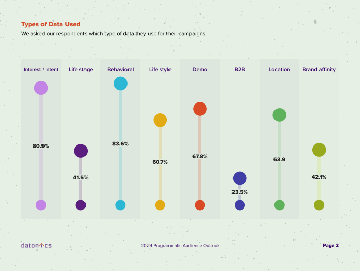 至于在他们的广告活动中使用的第三方数据类型,项目团队成员指出,行为(84%)和兴趣/意图(81%)是首选,Demo(68%)、位置(64%)和生活方式(61%)也很受欢迎。