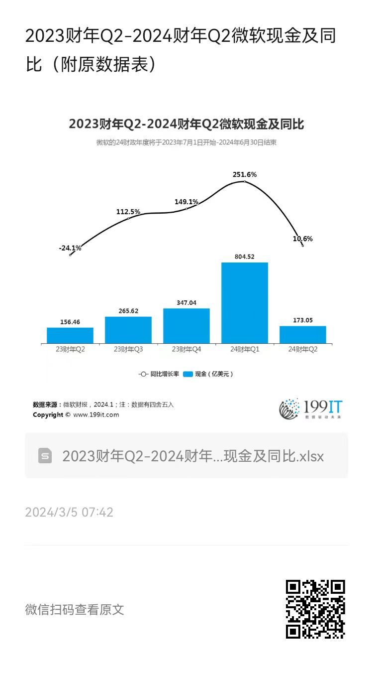 - 2024财年Q2-2025财年Q2微软现金及同比(附原数据表)