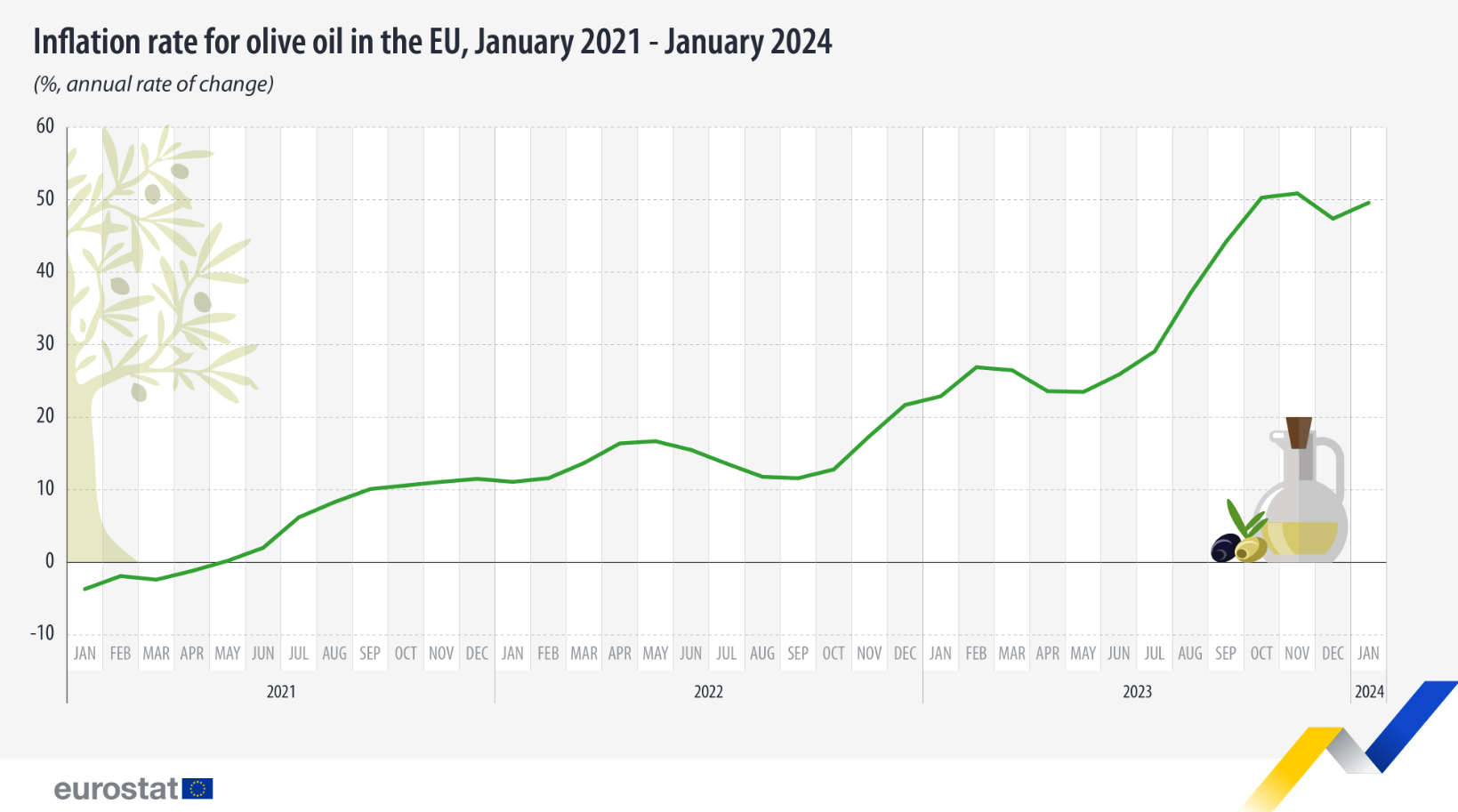 2024年1月,欧盟的橄榄油价格比2023年1月高出50%。