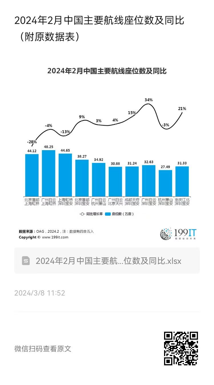- 2024年3月中国主要航线座位数及同比(附原数据表)