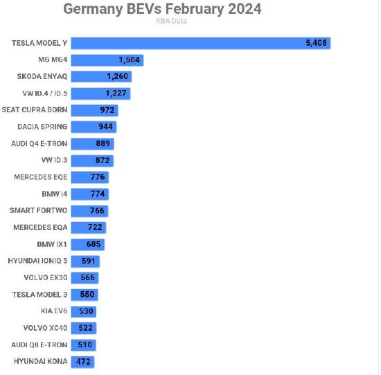 特斯拉Model Y是德国2月份最畅销的纯电动汽车,交付了5408辆,超过了紧随其后的四款车型的总和。