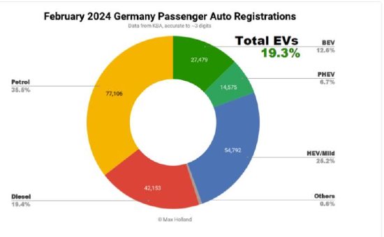 据CleanTechnica网站,德国2月新能源车市场份额从上年同期的21.5%降至19.3%。其中,纯电动汽车市场份额从上年同期的15.7%降至12.6%,销量同比下降了约15%。