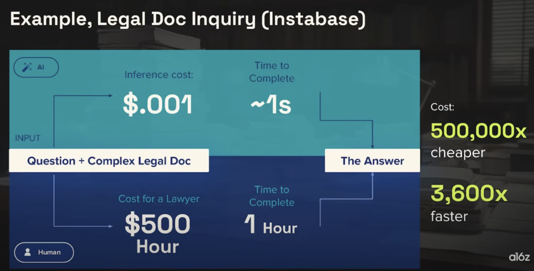这不仅仅限于图像,对于任何类型的语言理解也是如此。拿一个复杂的法律文件来举例,我可以将一个复杂的法律文件输入到一个大型语言模型(LLM)中然后进行提问。和人工相比的话,我的律师可能需要阅读它、理解它。我不知道律师的平均费用是多少,但大概是500美元的标准吧。所以使用LLM比雇佣律师便宜和快速了四到五个数量级。
