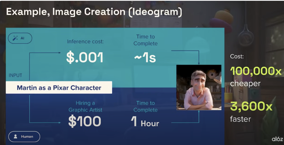 假设我,Martin,,想要创造一个我的皮克斯角色。如果我让其中一个人工智能模型来做,实际的推理成本大约是0.01 美分,而且只需要一秒钟。和人工相比的话,雇佣一个平面设计师一小时大约是100美元,实际上要比这更贵,我以前走过这条路。所以,人工智能不仅仅是稍微好点,它不是好 20%,而是便宜和快 4 个数量级。